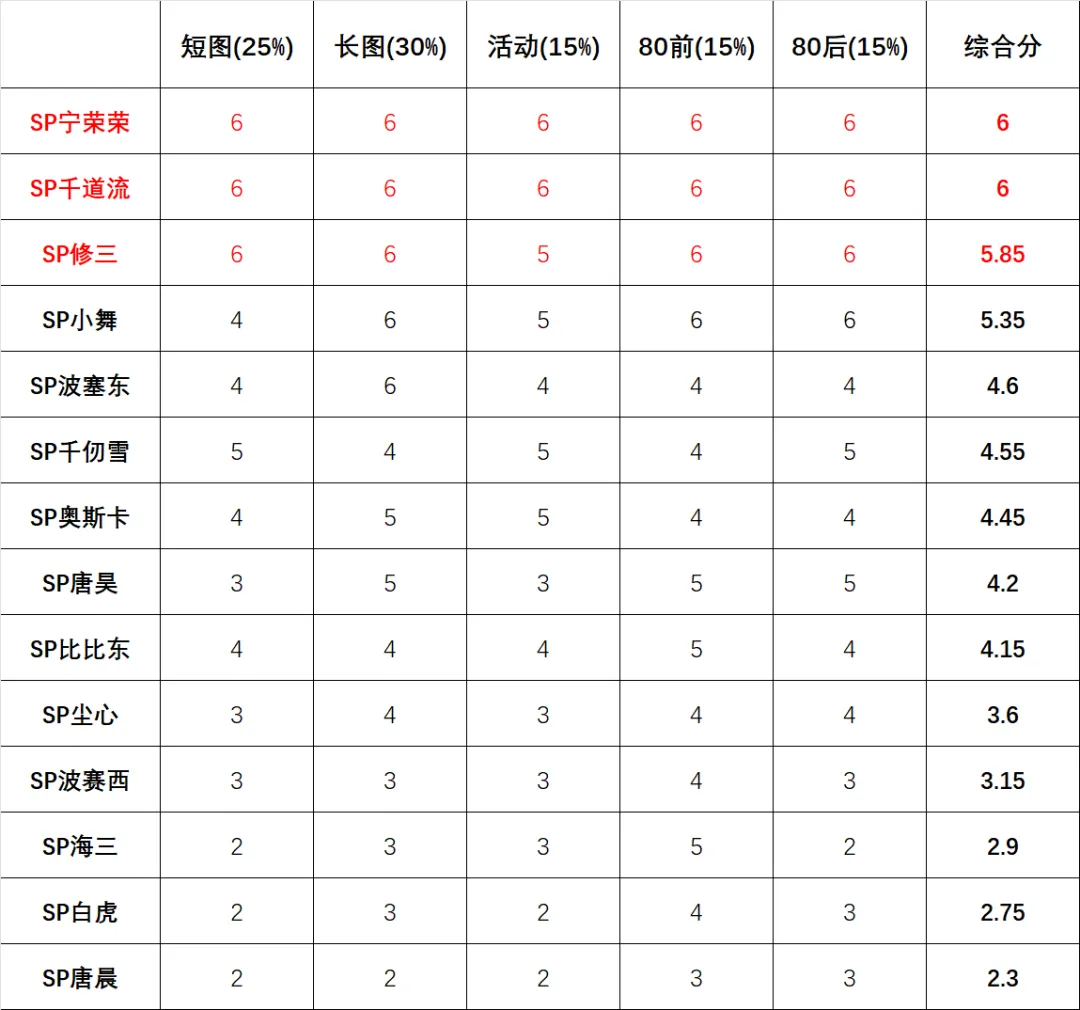 那么如果按照上述的评星,2星算2分、3星算3分......5星+算6分的话,这12位SP魂师的排名如下(鉴于玩PVP的玩家还是少数,所以短图权重为25%,长图权重为30%,活动权重为15%,PVP权重为30%):