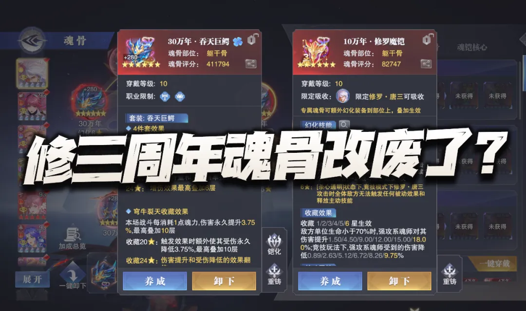 因此就目前这个SP修三的专属魂骨改动来看,的确有点让人挺尴尬的感觉,你说它本身优先级要低于SP宁荣荣的这块已成定局,这次就是改不改也都会这样,但SP修三周年庆魂骨的成本可是足足480抽保底啊,这个成本是要远远高于SP宁荣荣这块的,所以其囊括的克制范围大可不必改到太小的地步,这个问题也希望官方能够好好思考一下,哎。