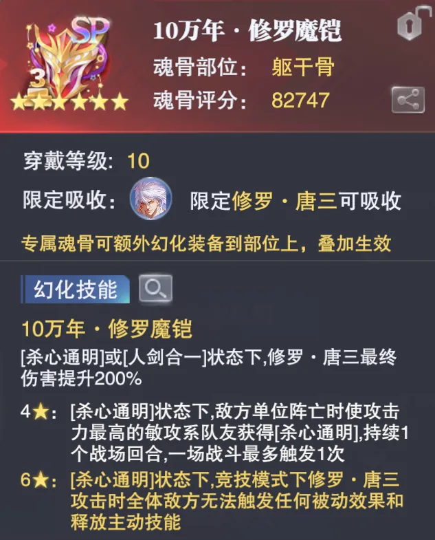 SP修三开局即使抢到全场爆伤最高触发了“杀心通明”状态,但如果对方恰好有SP宁荣荣右臂专属魂骨且又拿到了4神护的话,则对方依然会先于我方行动(这也是修三这块魂骨的优先级不如荣荣那块的一个具体表现)