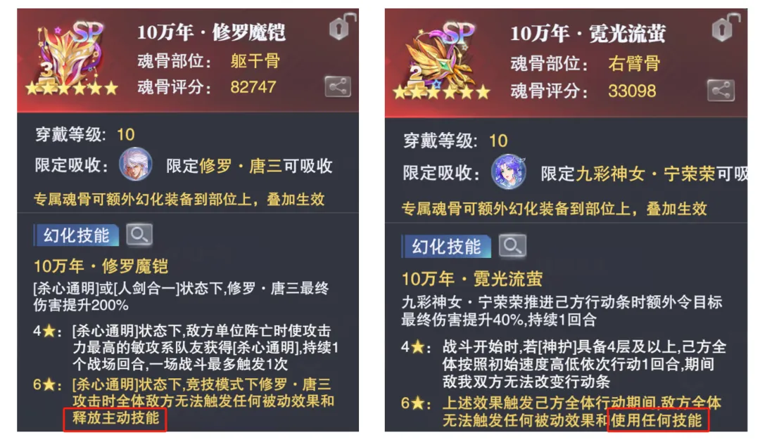 接着我们来简单对比一下SP修三和SP宁荣荣他们两块周年庆魂骨的描述区别,在同为6星的描述效果下,敌方全体无法触发任何被动效果这一条描述是完全一样的,但后面SP修三魂骨写的是“无法释放主动技能”,SP宁荣荣魂骨写的则是“无法使用任何技能”,当然按照魂师对决这款游戏过去的文案描述传统来看,扣这么细其实并不太像是官方过去的常规操作,因为过去什么错字、未实装、各类bug等问题都非常常见,而这个无法释放主动技能和无法使用任何技能,真要去细究主动技能和任何技能的区别,当然也可以得出一些结论,例如拓跋云的龟壳是自动触发的,不算主动技能等......