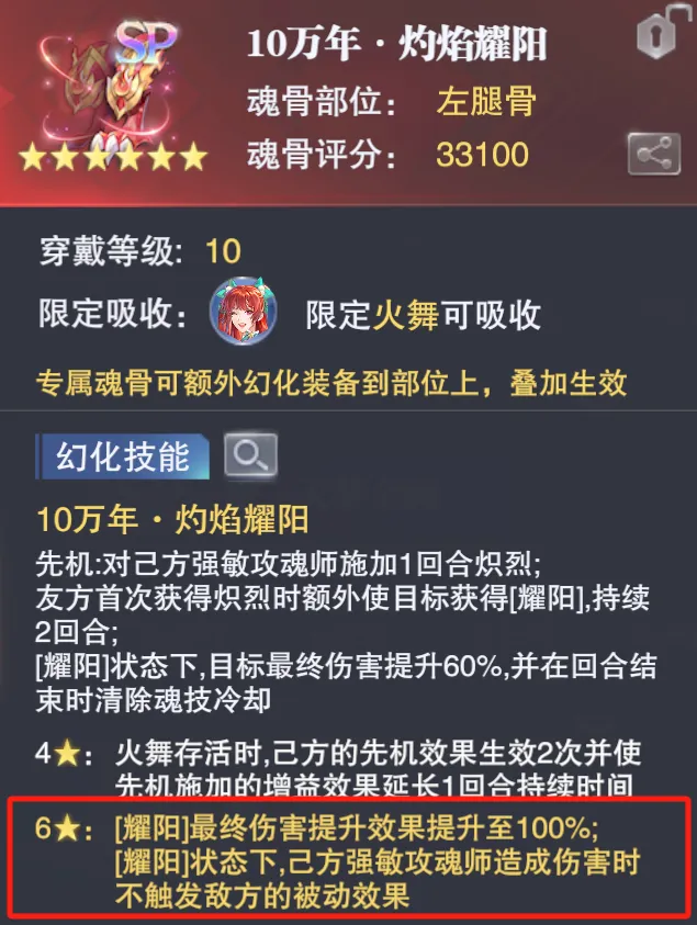 而如果这里维一再搬出火舞的左腿专属魂骨来,大家可以看看其6星也有“耀阳”状态下强敏攻魂师的输出可以不触发敌方的被动效果的描述,但真的就可以无视一切对方的被动效果了么?例如刚刚维一举过的例子,即使不带SP宁荣荣右臂魂骨,只带SP修三周年庆魂骨,对方的SP小舞也无法触发代替友方去死和当前回合免疫伤害的被动效果,但如果我们连SP修三周年庆魂骨也不带,只带火舞左腿魂骨的话,对方的SP小舞就可以触发让队友不死和全体当前回合免伤的效果了,所以这个无视被动其实真就有点笑话的感觉,最主要还是官方想不想让你无视了。