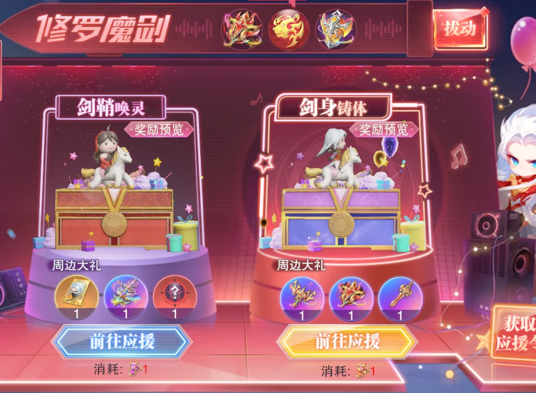 首先此次的应援氛围剑鞘和剑身两个类型,其中剑鞘应援属于普通应援,而剑身应援则属于高级应援。