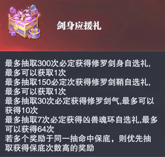 此外这个“修罗剑气”是每30抽保底一次的,然后全服奖励会送5个,相当于如果大家是冲着300抽保底的剑身器源去抽的话,最后还能获得10个+5个=15个修罗剑气,这部分就得看运气咯......