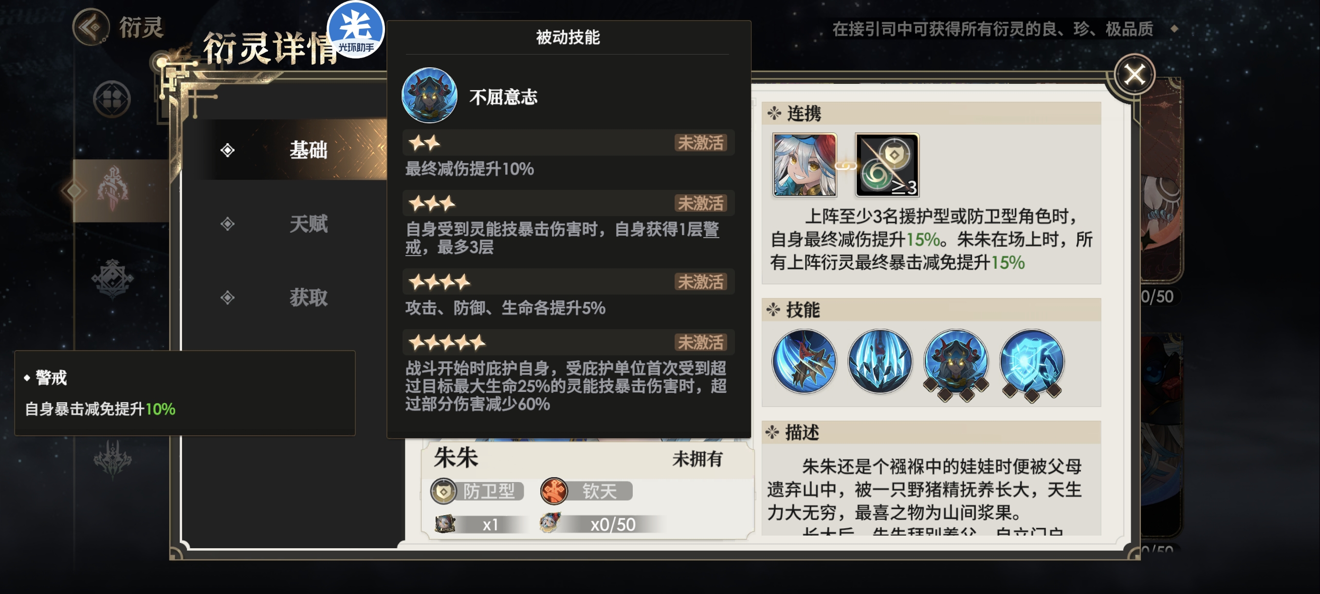 除了防卫型常规的被动加减伤之外,朱朱连携的光环效果能为全队提供15%的暴击减免。