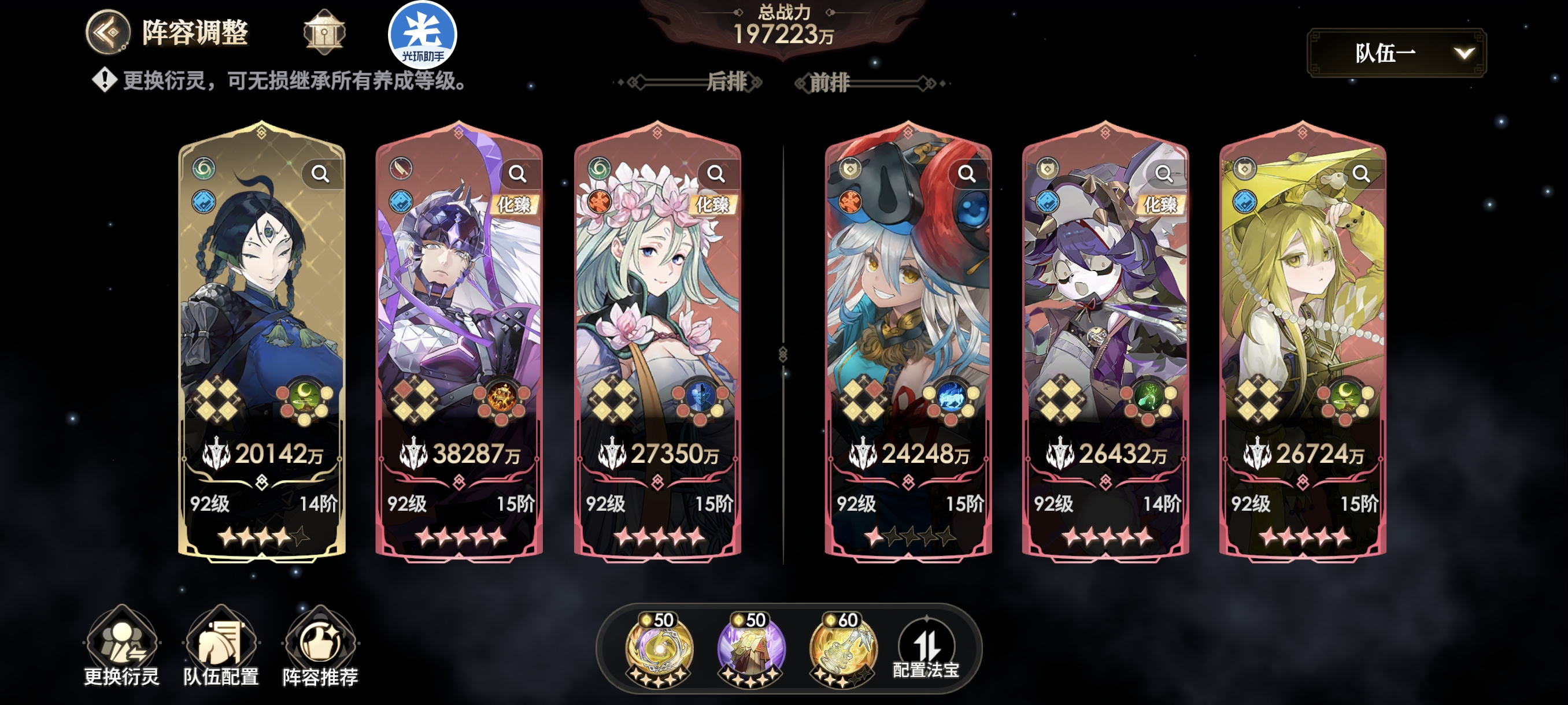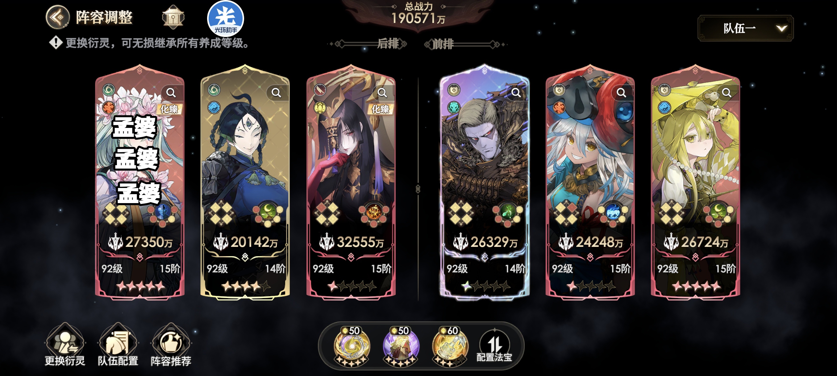 二、阵容推荐1、朱朱+牛魔王+多闻天王+广目天王+地藏王+孟婆上阵6人连携全开