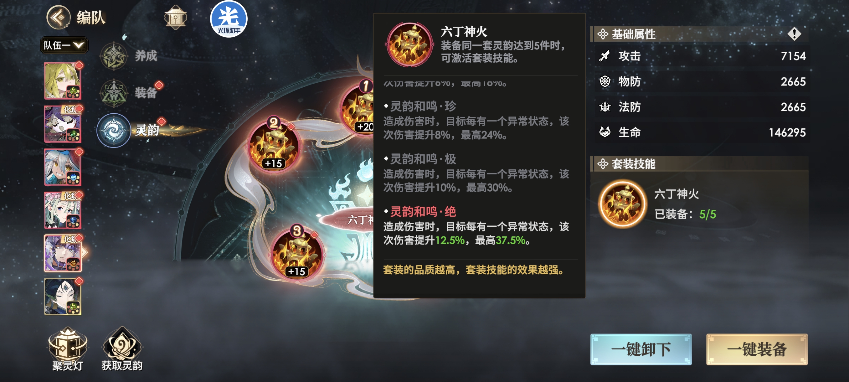 广目天王的功能与上面那套阵容一样,二郎神绝5的减伤光环再次加强了全队坦度,灵韵选择六丁神火的主要原因就是这套阵容在输出端略有欠缺,而二郎神哮天犬的吸取效果、朱朱的降暴击强度和灵韵-锯角退鳞的降伤害,可以提供大量减益效果,为六丁神火提供稳定的高额增伤,增伤能力比七十二变更强。