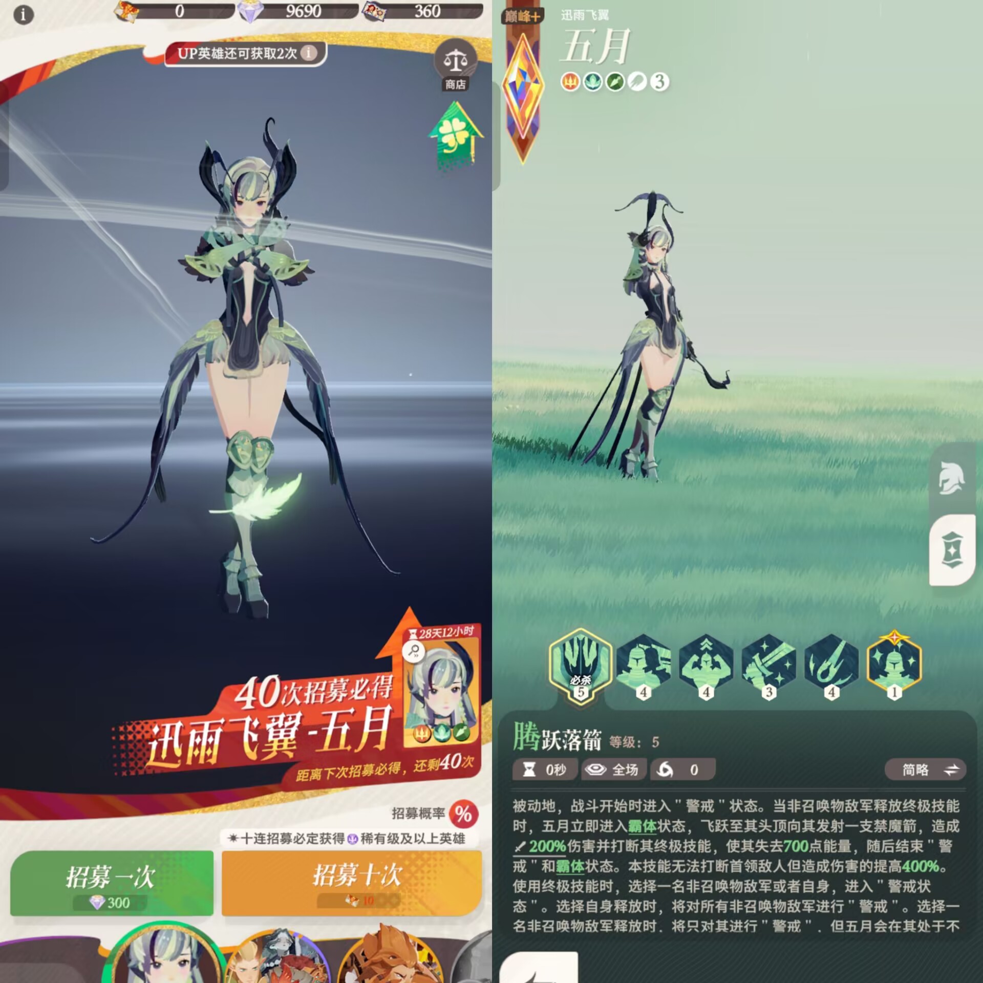 ①五月:一技能必杀技名为【腾跃落箭】。这个技能是五月的核心技能,也是五月的强大所在,当敌军释放终结技能的时候,五月进入霸体状态,飞到敌人头上造成伤害同时打断敌人释放的终极技能。