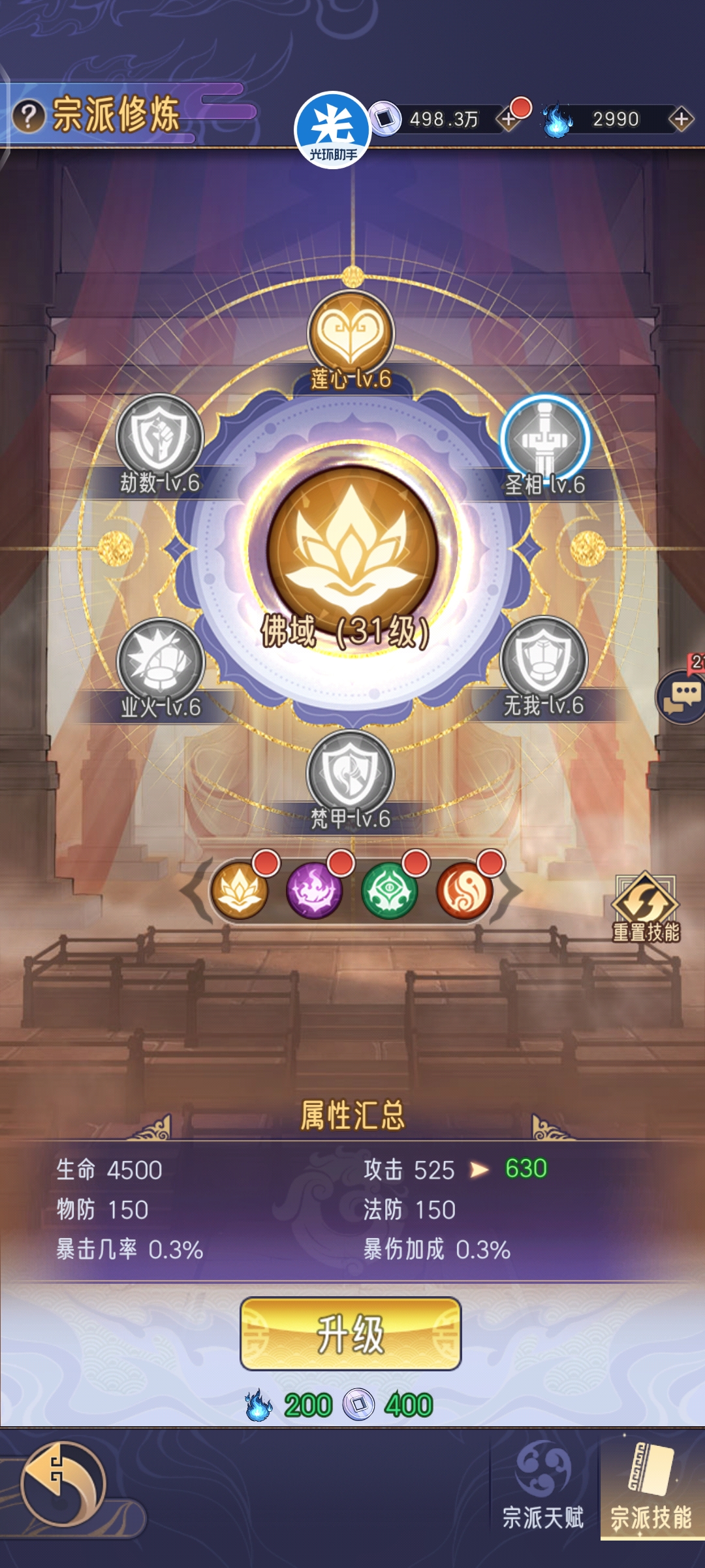 可以在宗派修炼中,提升不同种族角色得属性,在这个功能中优先升级自己所玩角色中,种族最多升级就行了。
