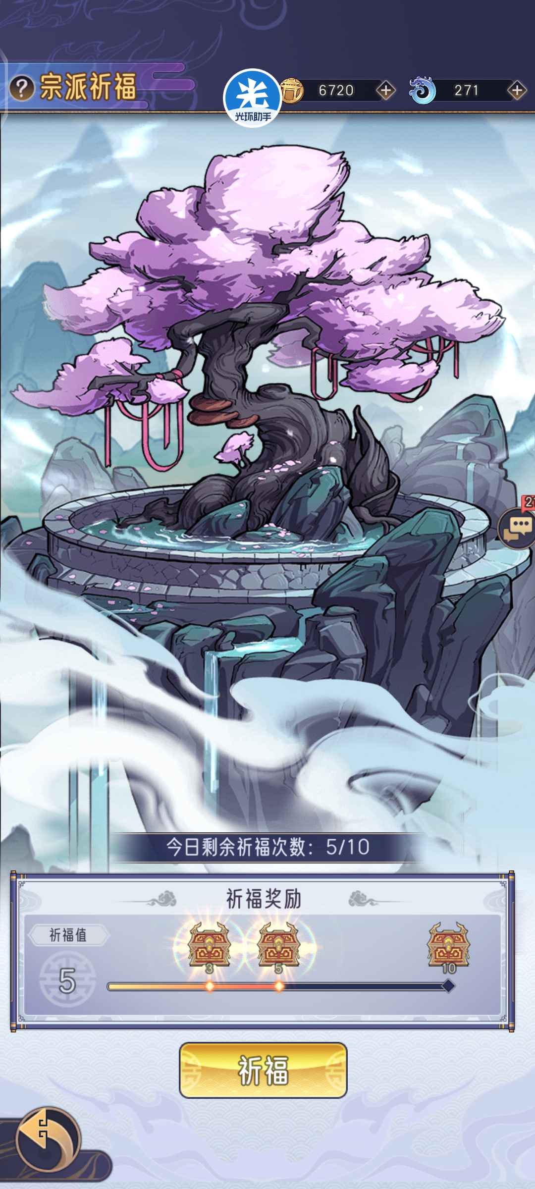 前五次是免费的,建议祈福五次就可以,在这里可以获得宗派修炼所需的的升级道具。