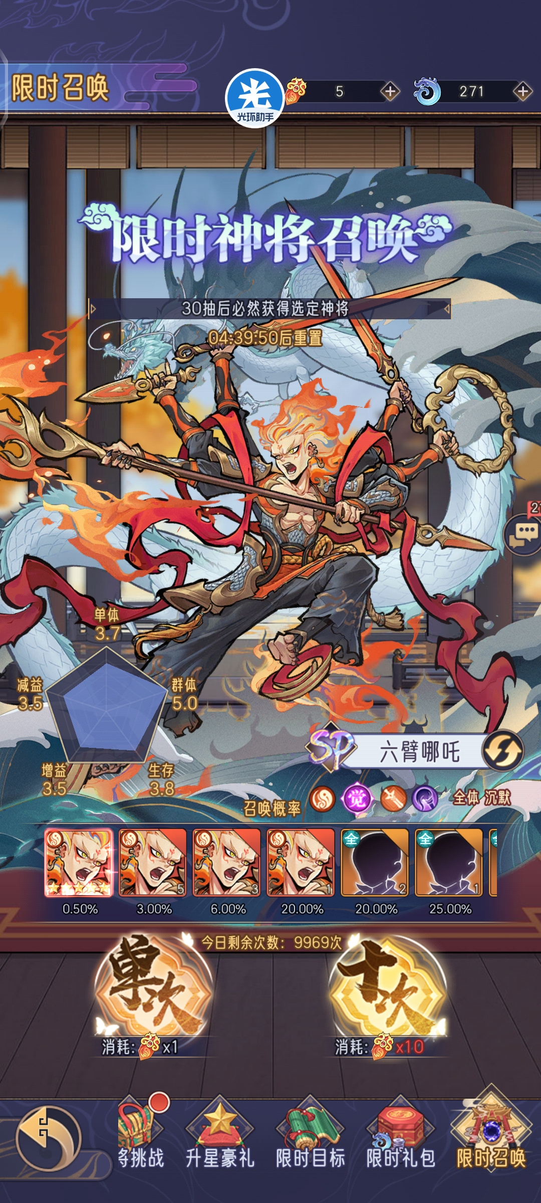 以上就是新手开服攻略第二天的内容了,第二天主要的活动感觉就是sp神将八臂哪吒的到来,其他的副本就是延续第一天的活动继续进行下去,跟踪进度获取更多的资源,玉千万不要浪费,只用在sp角色上就对了,ssr角色在今天正式淘汰。第二天总体来看不甘不氪,还不错,抽到两个哪吒圆满结束。