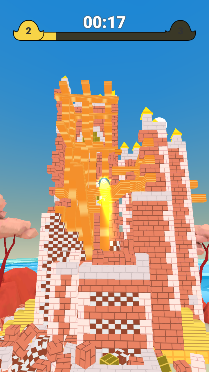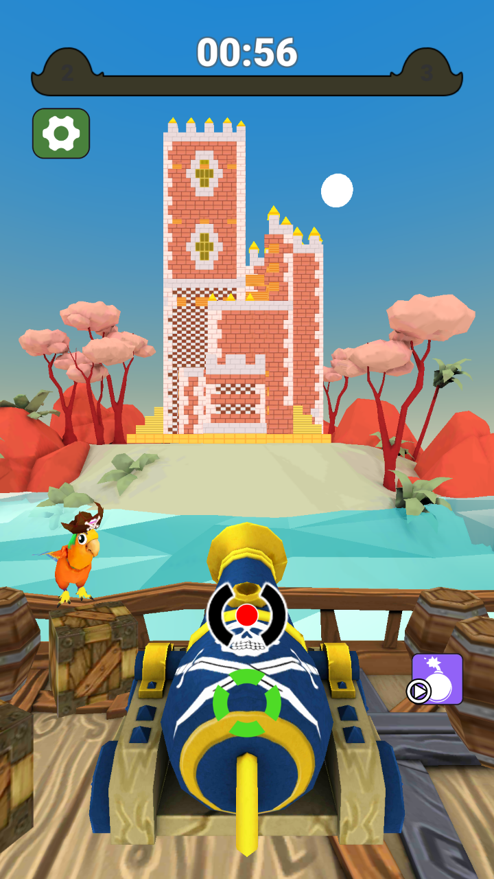 由于玩家的目的是摧毁关卡内的所有建筑,所以游戏贴心地在屏幕上方放置了拆迁进度条,玩家需要在限定时间内积攒进度,当然这个过程中的炮弹数量是无限的,无需担心资源的问题。不过我们还是需要找出障碍建筑的受力点和支点,只要命中这些弱点,建筑就会轰然倒塌,所以《海盗的重炮》并不是一款无脑射爆的游戏,还是需要玩家们动动脑筋。