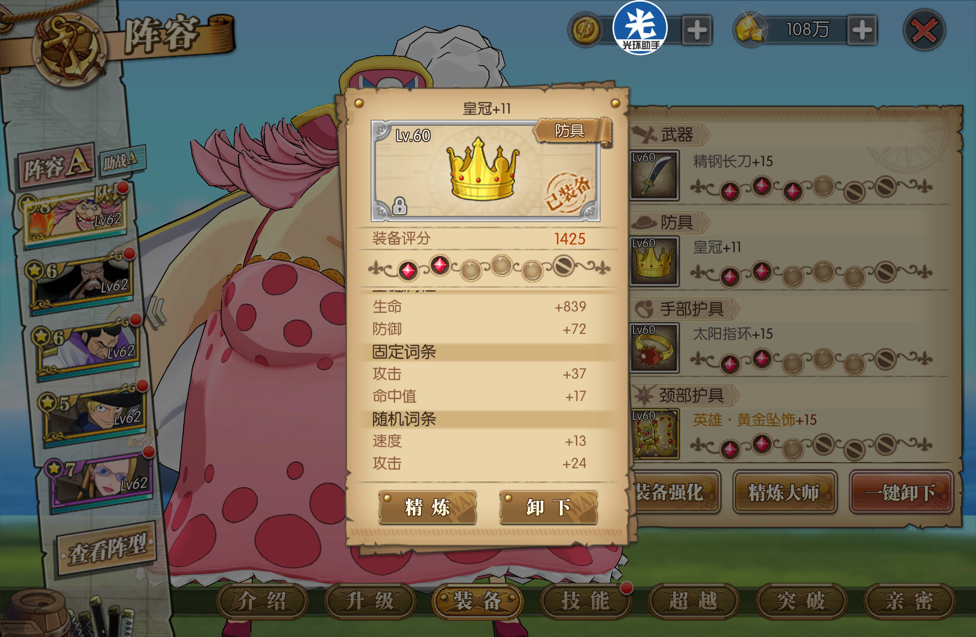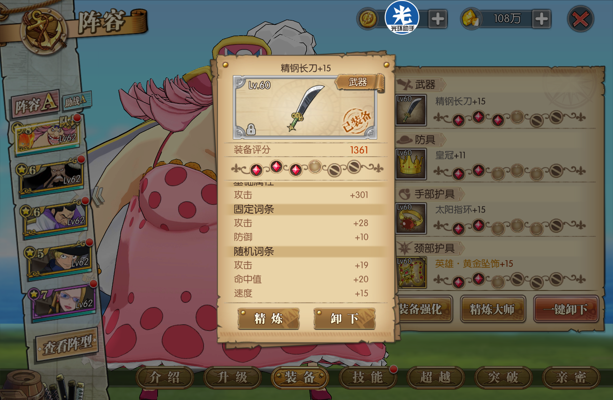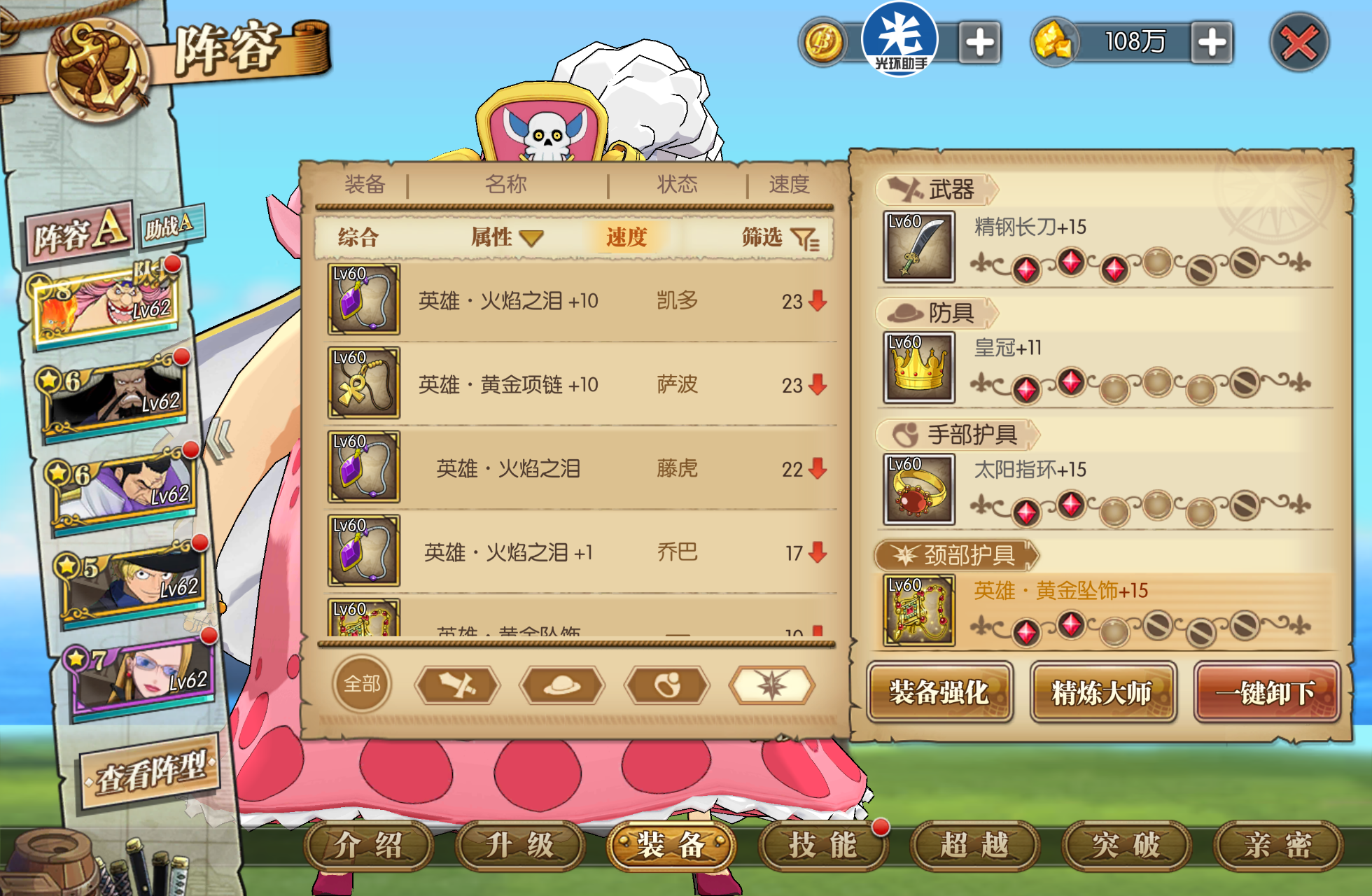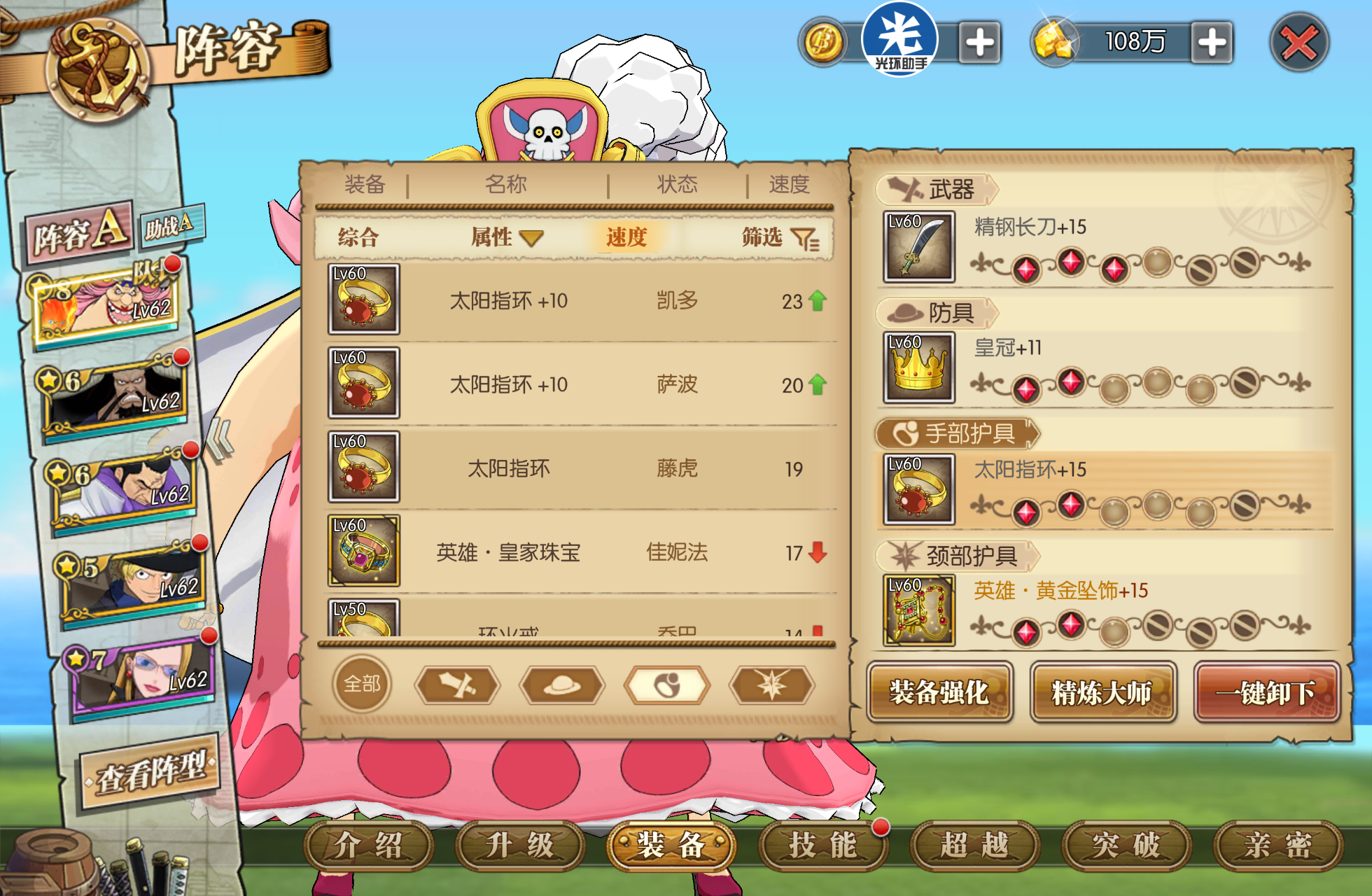 许多小伙伴快到60级的时候就会开始纠结,刷黄金套?刷公爵套?精灵来解答一下。公爵套固然是60级套装里最契合玲玲的套装,但还真没必要特意去搞一套,除非说你没打算培养玲玲。一般来说,玲玲作为大家的首选培养角色,到60级都六星八星的,能扛能打。60级速度散件(包括那些白装),其实和套装的单件属性相差不会很大,毕竟才60级,舍弃一点攻击属性,确保高速,既能兼顾竞技场,又能正常过图,还不用烦恼去刷装备。(速度散件中的精钢刀、皇冠、太阳指环这些在水都讨伐中就会掉落,只要你鉴定之后认真看看,不要随手就丢去熔炼,到60级的时候基本都会有4套速度散件了。)