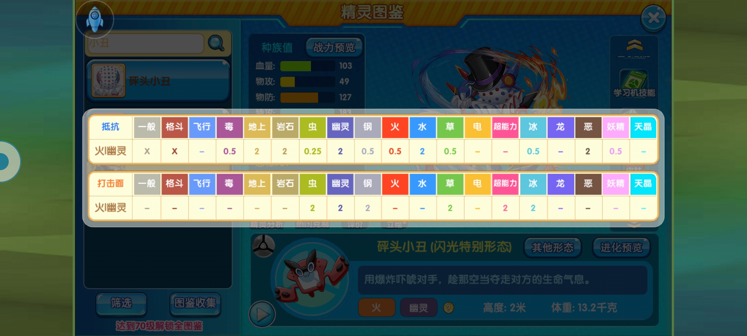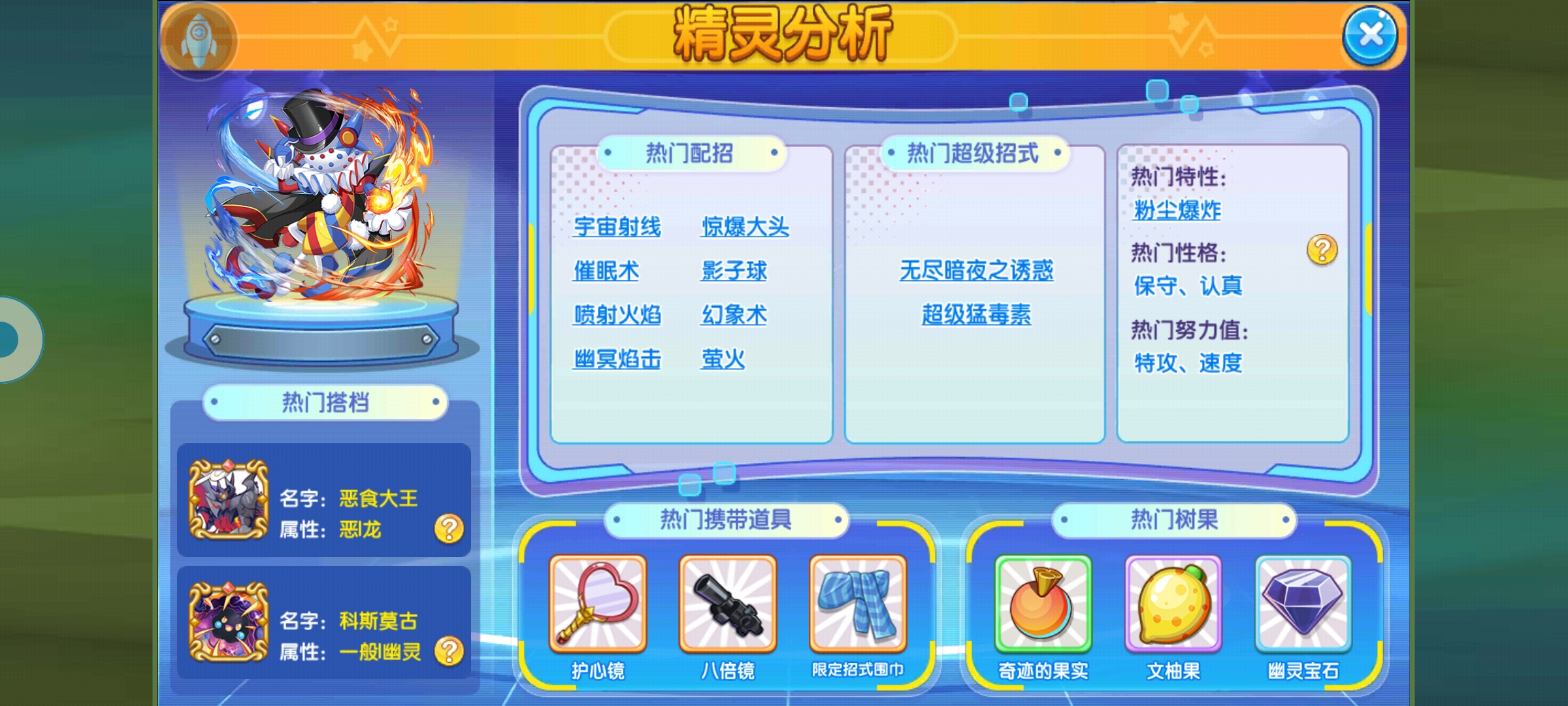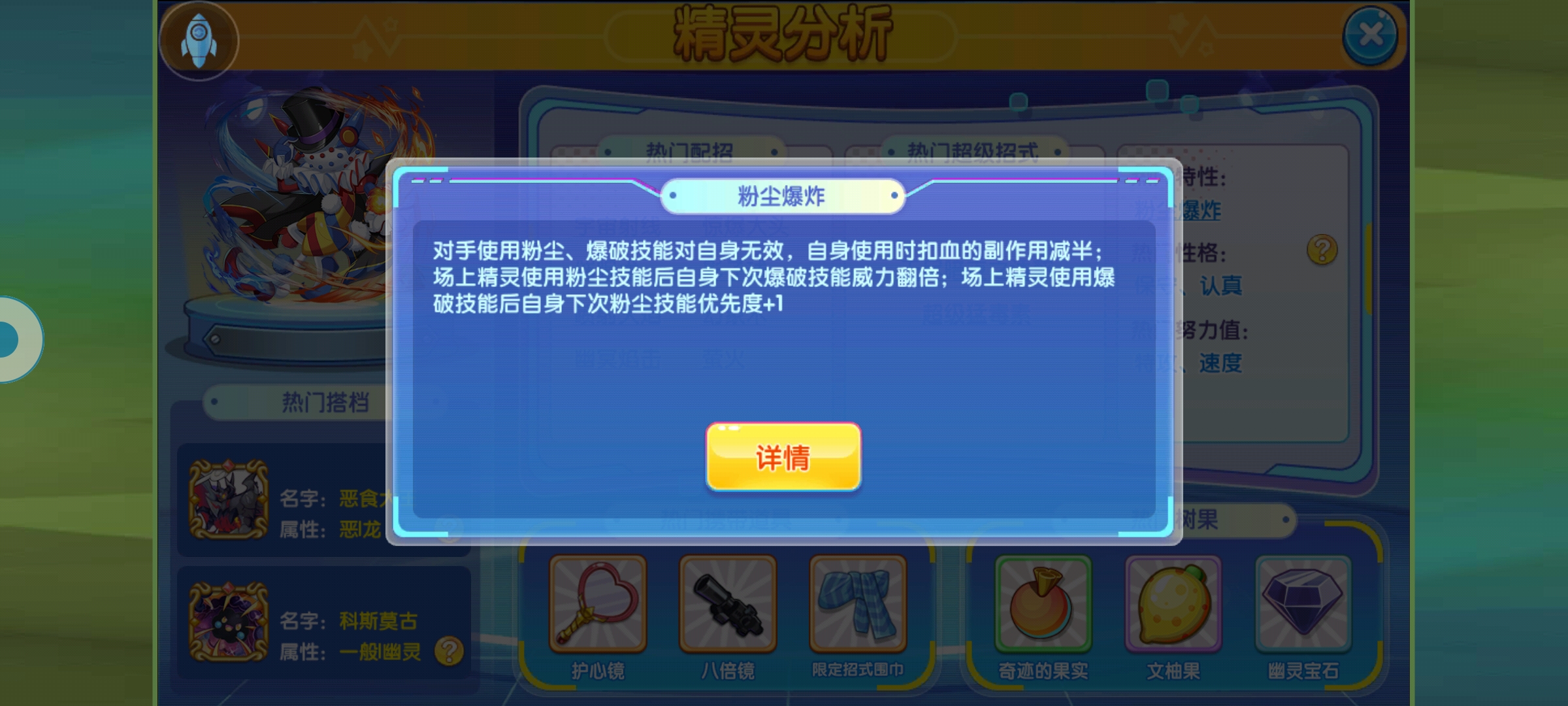 砰头小丑特性免疫爆破类和粉末类技能,那么当前版本这两类技能都有什么呢?爆破类技能:大爆炸,岩石爆破,爆炎电击,空气爆炸,反物质星爆,蒸汽爆发粉末类技能:睡眠粉,蘑菇孢子,超级催眠粉。对面如果不知道它的特性可能会以为MISS了一直放,这个时候就是砰头小丑强化的机会。