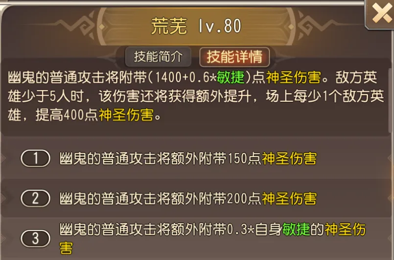 四技能——荒芜,幽鬼的输出技能,普通攻击附带神圣伤害,敌方存活英雄越少伤害越高,并且幻象可以继承荒芜技能。