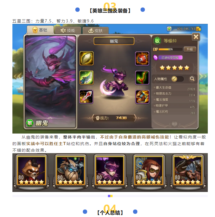 万金油物理前排核心,限时英雄保底抽80抽准没错。周年庆版本限时英雄可以看出莉莉丝对幽鬼的期望很高,并且实战来看也确实符合预期,不像当初的虚空那样翻车,有条件幽鬼可以上个四星,百搭配队前排还是值得一练!