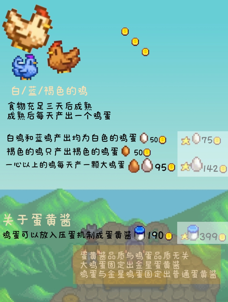 关于基础小鸡李浩阳爱吃屎发布于 2024-08-15关注刚开鸡舍的兄弟们可以参考一下鸡舍建造之前一定要有一个筒仓不然你的小没有草吃好感度就不会增长前期养鸡是系统的任务 但是前期发展畜牧会拖慢你的速度看情况而定吧兄弟们。 注 白鸡蛋/大白鸡蛋 褐色鸡蛋/大褐色鸡蛋都是游戏100%进度的一项 星露谷物语