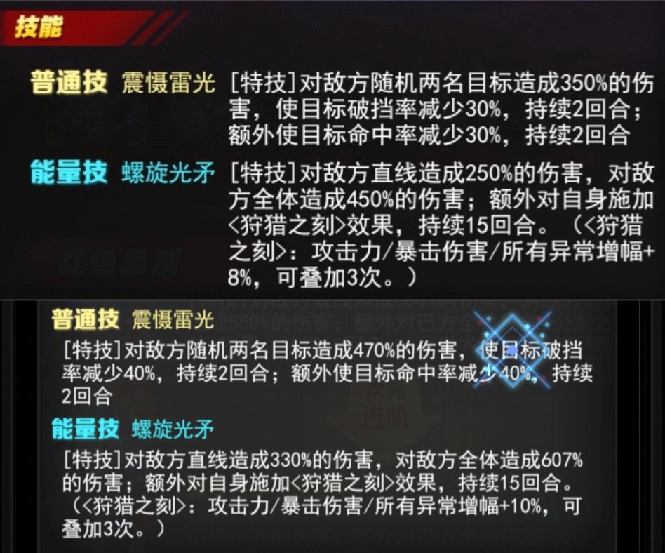 +17 能量技螺旋光矛[特技]对敌方直线造成330%的伤害,对敌方全体造成607%的伤害;额外对自身施加<狩猎之刻>效果,持续15回合。(<狩猎之刻>:攻击力/暴击伤害/所有异常增幅+10%,可叠加3次。)