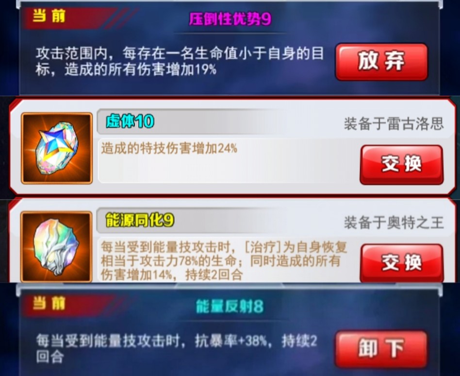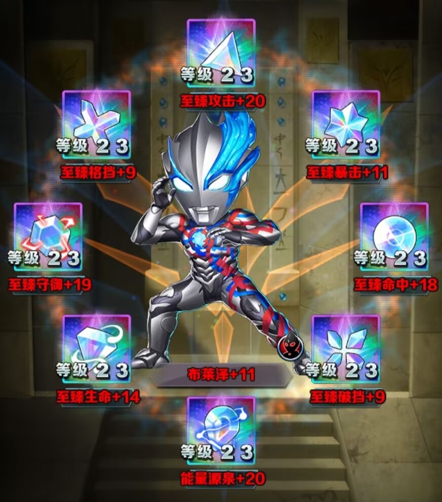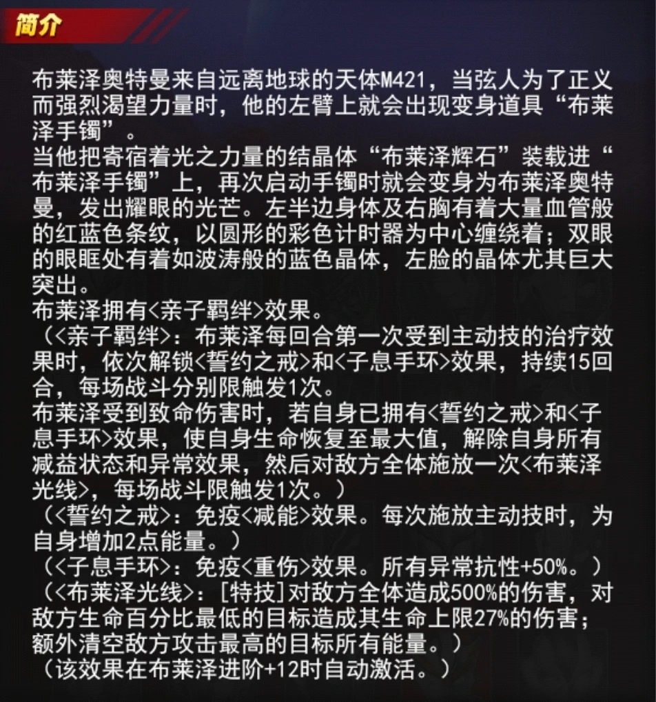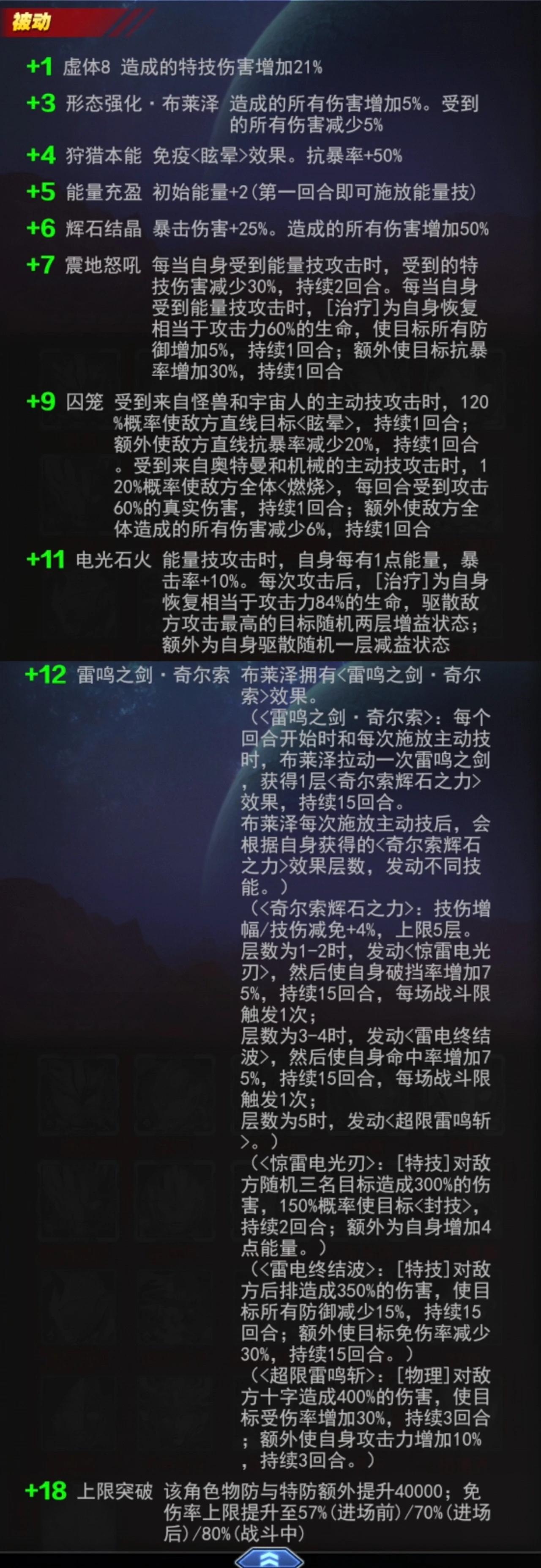 解析:受到宇宙人和怪兽的攻击时,120%的概率直线眩晕对面是这两个条件你就会获得一个反击 眩晕还有一个直线的减抗暴能力如果说是奥特曼和机械角色打你的话有一个120的燃烧然后会减对面的一个全伤所以说这个被动配合着打本还是很不错的再包括他大招有30%的一个异常增