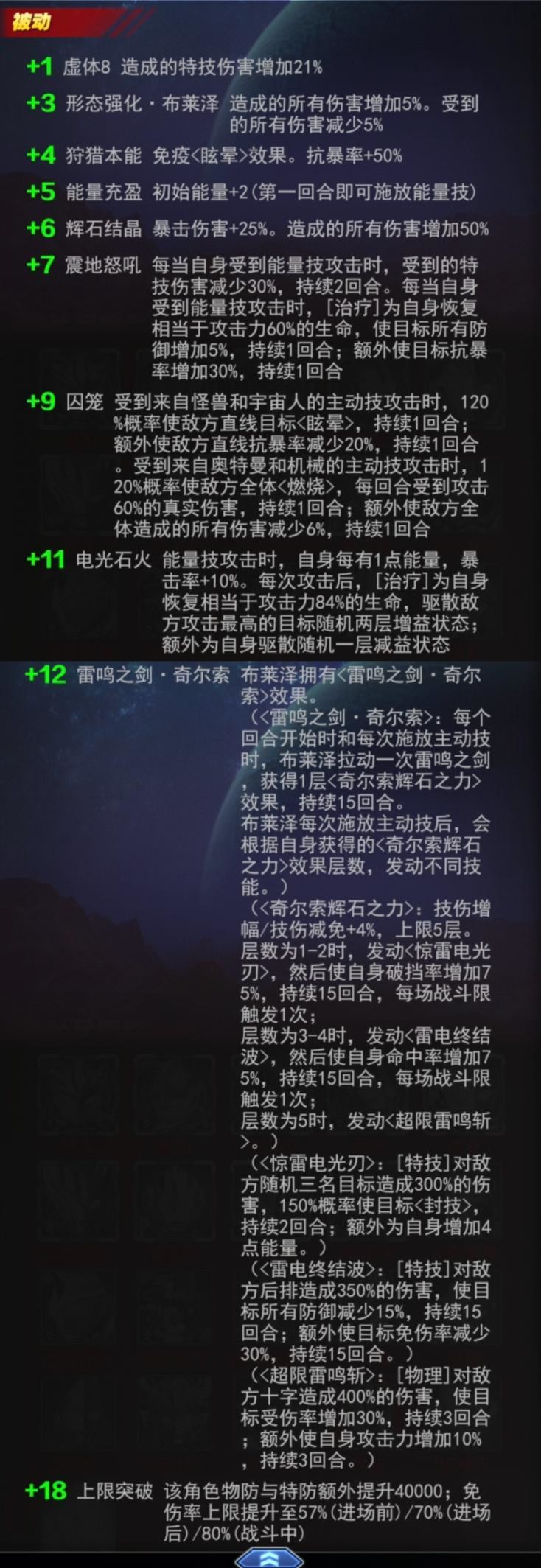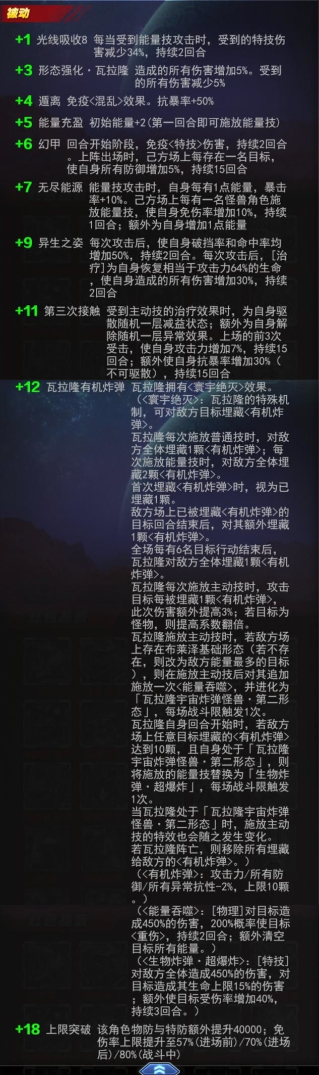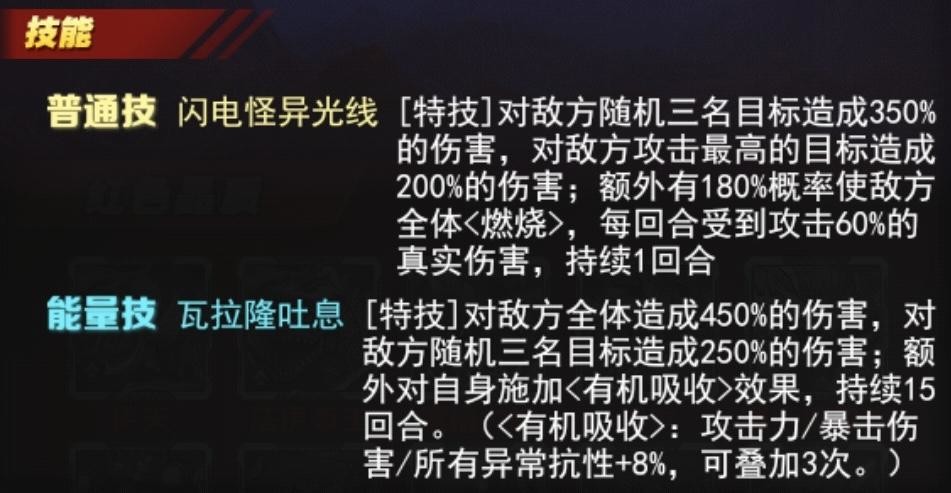 能量技 瓦拉隆吐息 [特技]对敌方全体造成450%的伤害,对敌方随机三名目标造成250%的伤害;额外对自身施加<有机吸收>效果,持续15回合。(<有机吸收>:攻击力/暴击伤害/所有异常抗性+8%,可叠加3次。)
