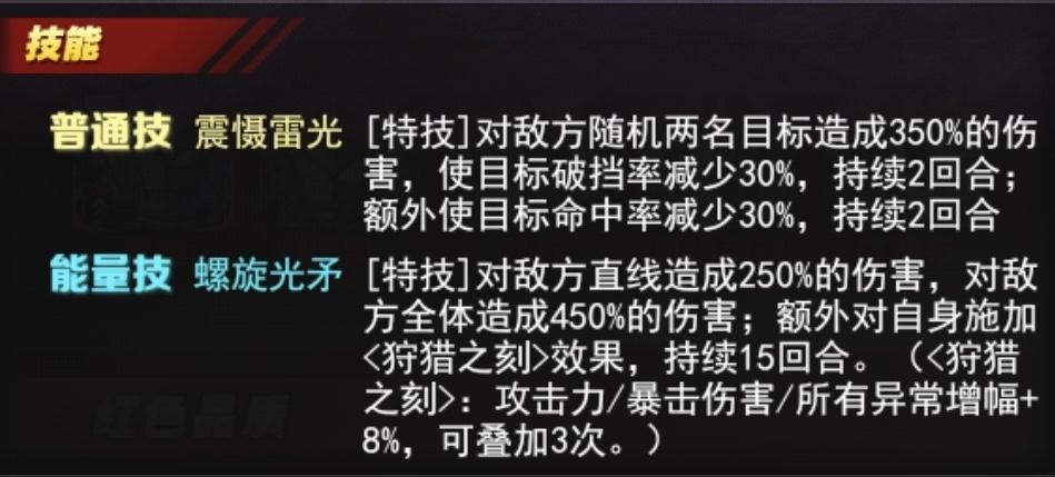 能量技 螺旋光矛 [特技]对敌方直线造成250%的伤害,对敌方全体造成450%的伤害;额外对自身施加<狩猎之刻>效果,持续15回合。(<狩猎之刻>:攻击力/暴击伤害/所有异常增幅+8%,可叠加3次。)