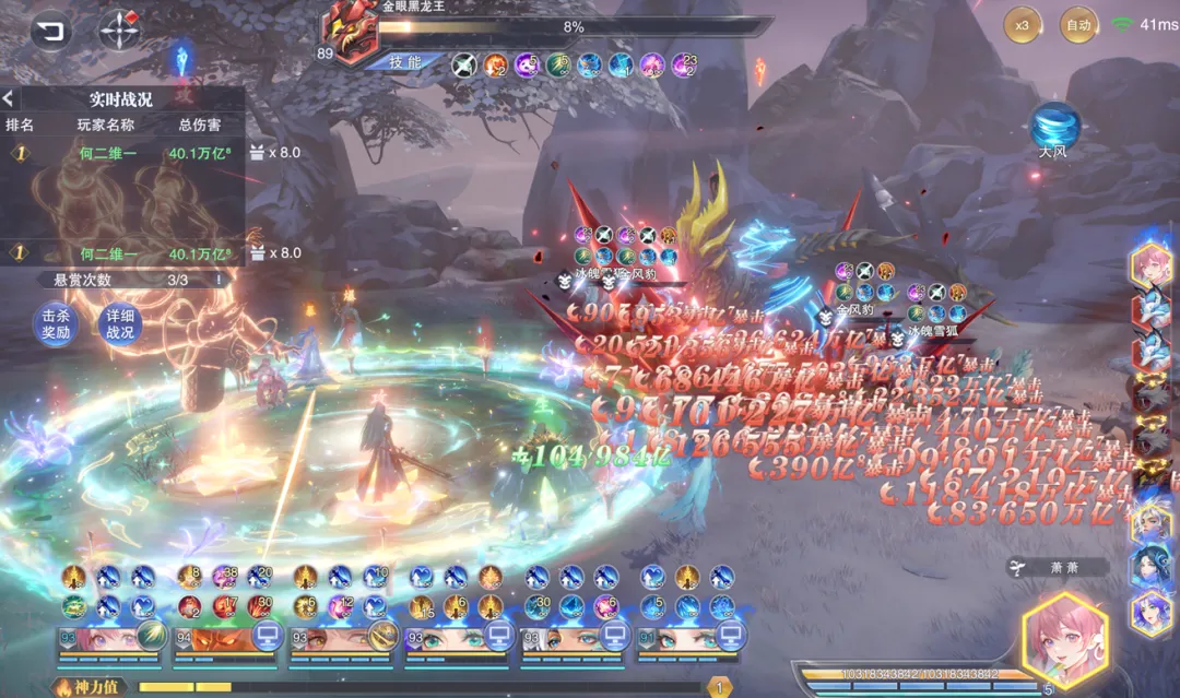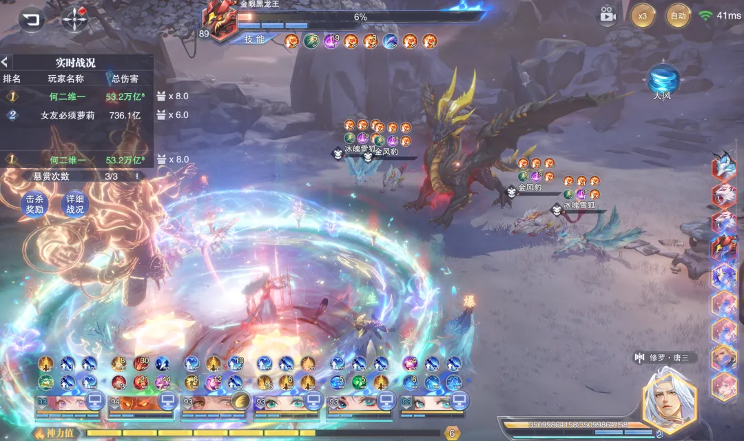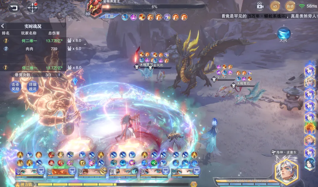 那么由于维一曾经过养过3控,所以今天也是把第3个控制位给拉了拉,刚好够得着上场的门槛,所以我也就分别用SP阿银替代了SP波塞冬、萧萧和拓跋云来做了个伤害的对比测试,以供大家参考,另外这个测试号的战力约为150亿左右,测试的boss为神地悬赏最高品阶的敏攻系boss,天气为大风天,上场的魂师配件都几乎是满配状态,最多也就少1个进化魂骨这些资源,此外全部阵容都是6神佑打底,大家知晓即可。