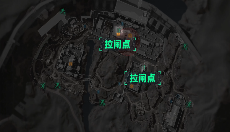 目前地图中的拉闸点仅有两个。一个在行政辖区西楼二楼的房间里,另一个在主变电站右上角的房间里,只需拉下其中一个就能开启撤离点,撤离点共计可以开启2次。