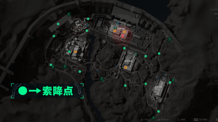全地图一共有14个索降点,干员小队会在行动开始后随机降落至东部或西部其中一个点位,而固定撤离点在东西两侧各有一个,索降在西侧的干员固定撤离点在东侧,对应地索降在东侧的干员,固定撤离点则是在西侧。