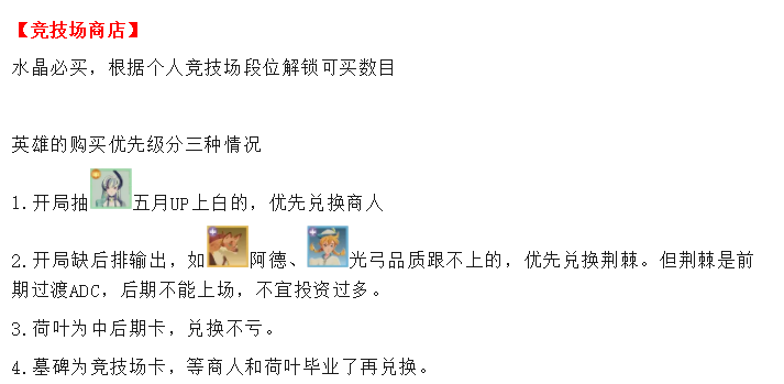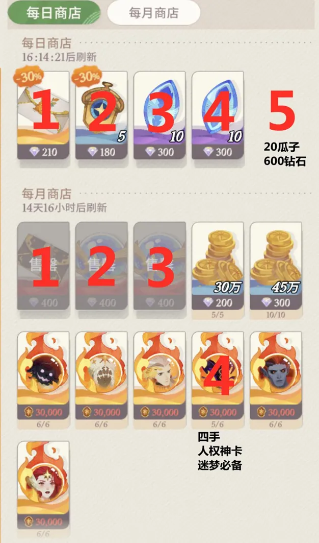 《剑与远征:启程》全商店购买兑换优先级建议剑与远征 - 攻略星发布于 2024-08-20关注【招募商店】每月更新,通过我们平时抽卡和占卜得到的资源,抽卡越多,得到的集换卷会越多。以下为购买顺序,打折优先。开荒首月我们得到的抽卡资源会最多,随着游戏进度的变慢,抽卡资源也会相对少一些,所以建议平民购买完1234后,把资源囤到下个月,后面资源确实多了,再集中兑换种族果子。氪佬抽卡资源多,可以继续兑换打折的灵魂石。 【公会商店】1.每日商店招募卷必买;种族果子根据自己主力英雄种族来买,买到200个为止;瓜子买到150~300个(专武提升到5级需要150瓜子,前期等级低还没解锁到5级建议买到150就行)。 2.每月商店图里123花费钻石的必买;购买神魔英雄只能用公会奖章,是通过公会的宝箱和任务奖励得到的; 神魔只购买“四手”,也就是图中第4,相信这段时间玩下来大家在排行榜作业上都有看到这个角色,为迷梦增伤型辅助人权卡。四手每个月要买满,买到四手毕业之后,再考虑买第二人权神魔“蝎子”,也就是第5个。 【迷梦商店】兑换优先级S级:阿德,光弓 A级:枪兵,卡卡B级:老头,小羊可选:缺坦克换一张豹女,迷梦跟女骑组双破防CP选斧熊 【友谊商店】只购买第一个打折的礼物即可 【奇珍屋】这个我一开始没搞懂规则,原来是根据你花费的圣石币来解锁后面的商品,不需要挨个买,可以跳着买也行,最重要的是越到后面商品的性价比越高(价格不变经验更多)。因此,奇珍屋的购买方式是经验>灵魂石>装备,没必要全部商品挨个买,无法解锁下一个再回头买便是。 【铁匠铺】里面的武器装备比较贵,酌情购买 转载自:剑与远征小屋