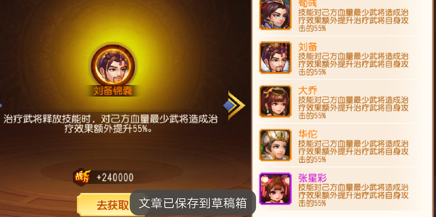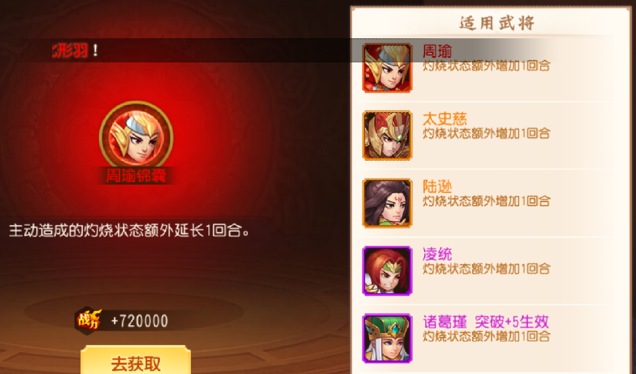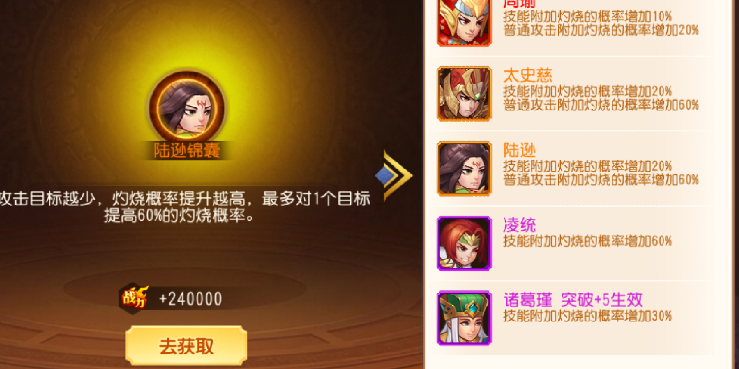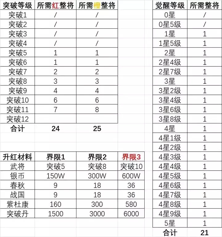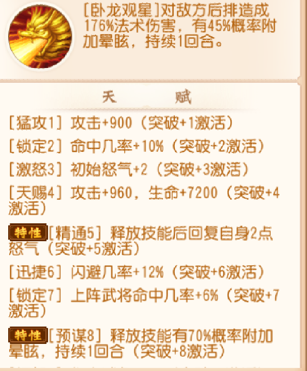 这个是重中之重了,需要突破丹和该将的0级武将若干。在0-75级阶段。突破+5最低45级和+8最低75级会有强大的特性加成。一般看武将特性,我们通常也只看+5+8+10+12以及本身技能和神兵技能。这些特性决定了一个武将自身的发展方向。当然锦囊玉石的加入还是对武将的特性发生了些许改变。