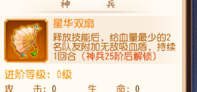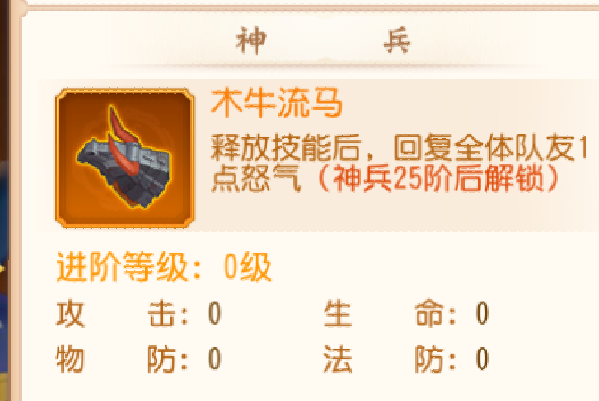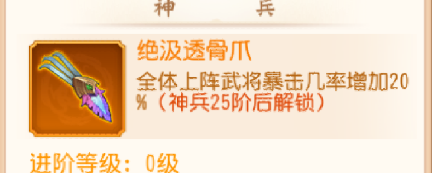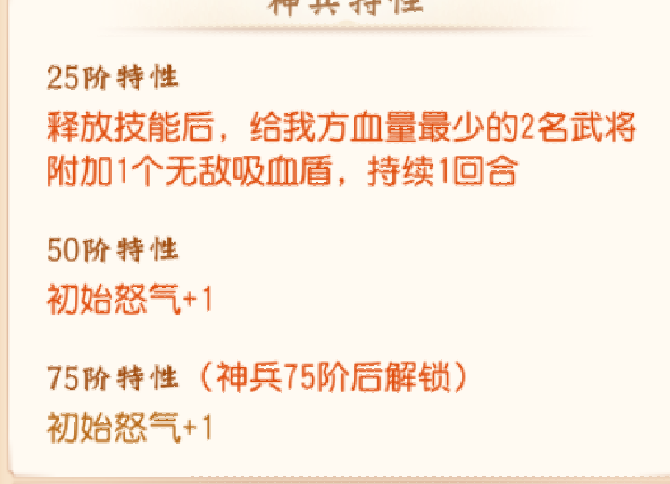神兵25.50.75,这三个阶段中神兵25级会给个武将的特性,50.75会分别增加起手的一点怒气。