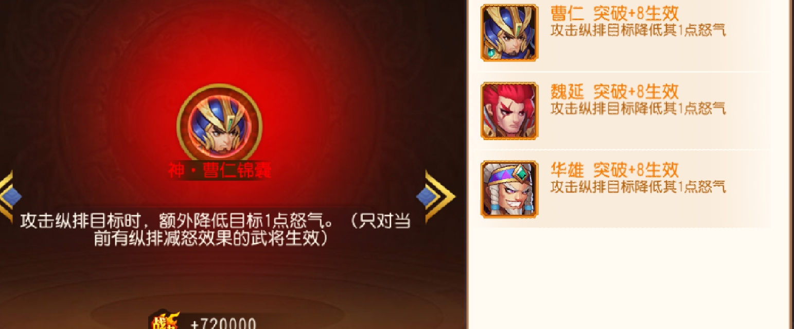曹仁能用吗?能用,并不完全能用,是要+8的曹仁才能使用。千万不要小瞧这个突破+8。在前期很多团为了破张郃小乔的盾,都会在战绩中打曹操,而曹操就会出曹操锦囊和神曹仁锦囊。这时会有很多萌新看着阵容里有曹仁,盲目的去拍锦囊,结果拍下来都要压箱底一段时间。前期元宝还是比较紧缺的情况下拍个压箱底的锦囊,而且还是后期没人要的锦囊,不明智啊……特殊通用类锦囊