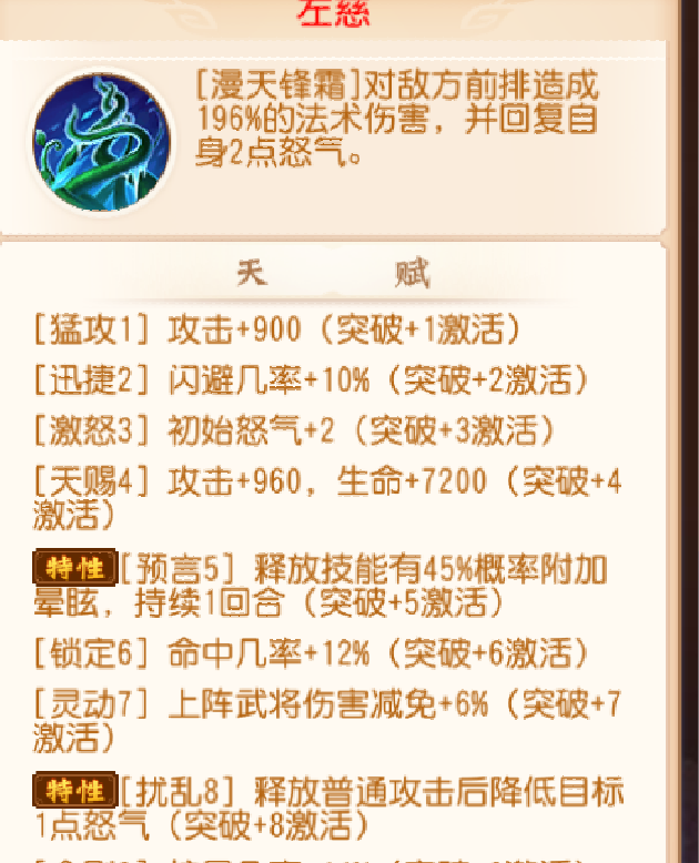 再比如左慈诸葛。诸葛本身技能就有了晕的控制,没有技能回怒,左慈是本身有技能回怒没有晕的控制。但却在+5的时候俩个将都有了回怒以及晕的控制,如果是左慈诸葛优先选一个+5选左慈更优。毕竟获得了控制技能,而诸葛只是获得了回怒效果。