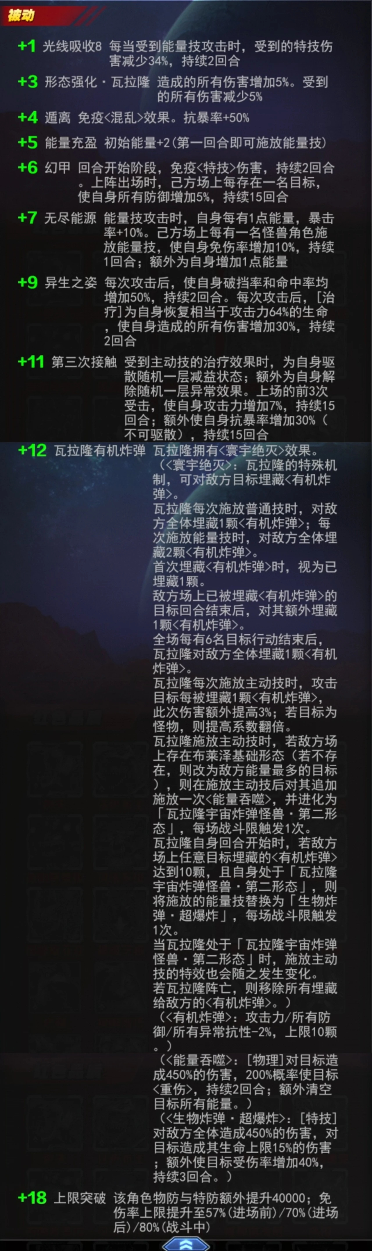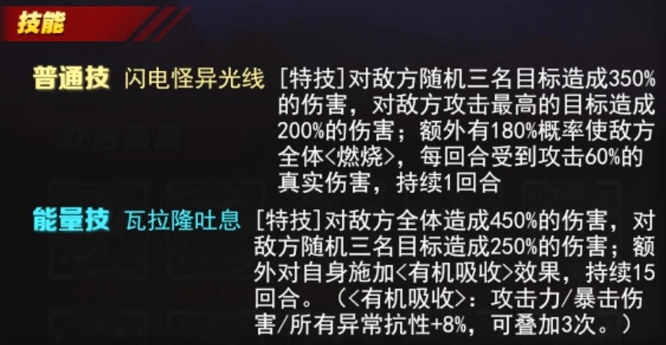 能量技 瓦拉隆吐息[特技]对敌方全体造成450%的伤害,对敌方随机三名目标造成250%的伤害;额外对自身施加<有机吸收>效果,持续15回合。(<有机吸收>:攻击力/暴击伤害/所有异常抗性+8%,可叠加3次。)