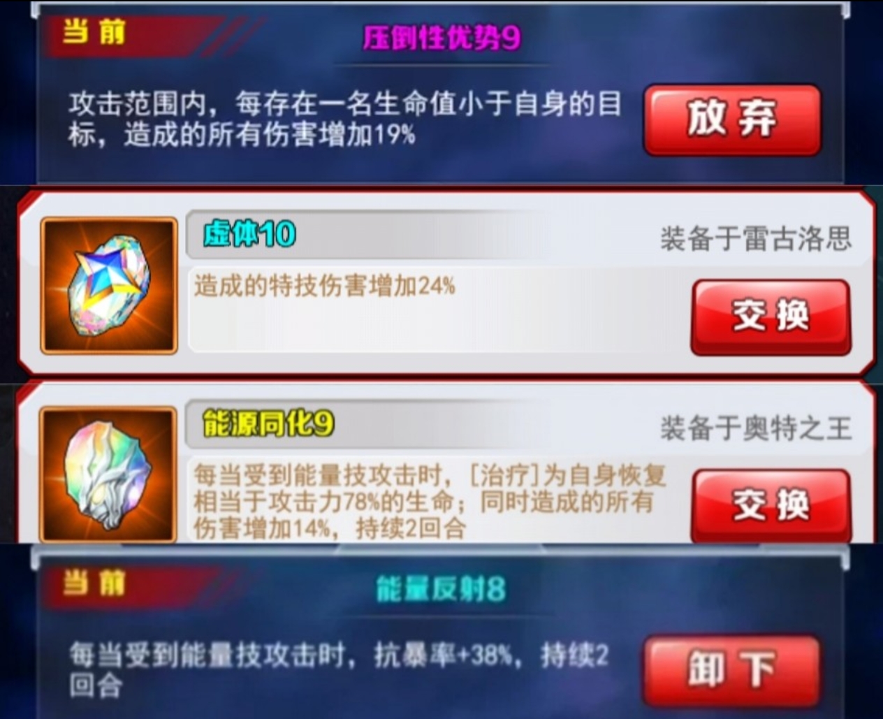 +7 无尽能源 能量技攻击时,自身每有1点能量,暴击率+10%。己方场上每有一名怪兽角色施放能量技,使自身免伤率增加10%,持续1回合;额外为自身增加1点能量