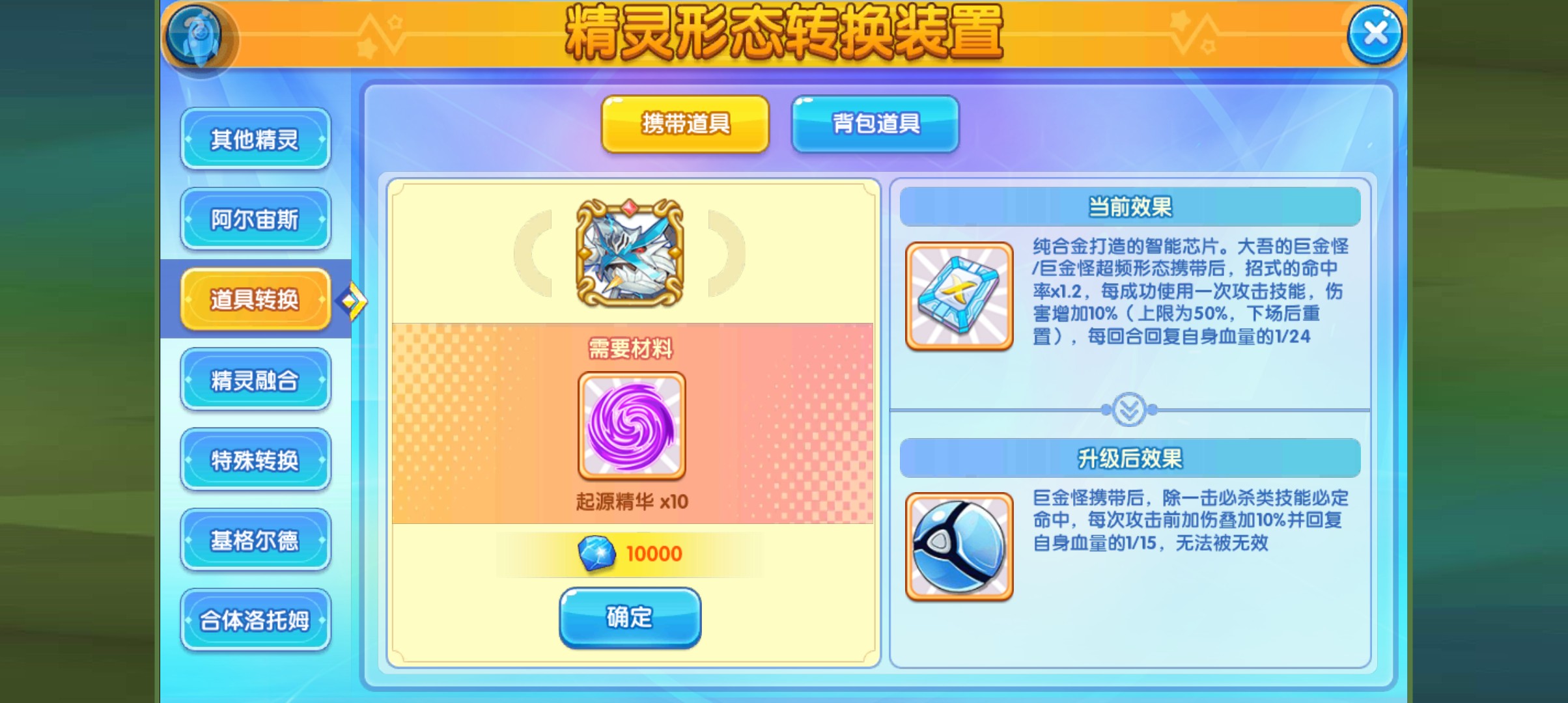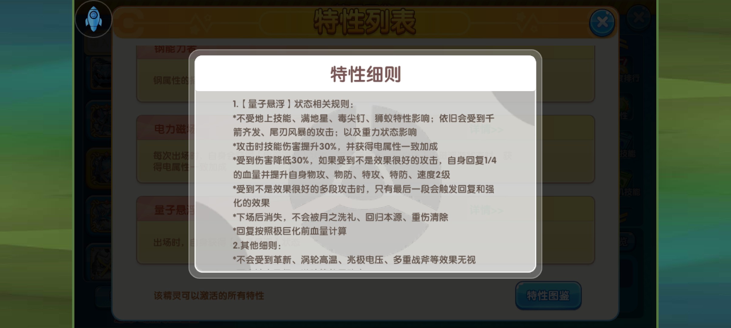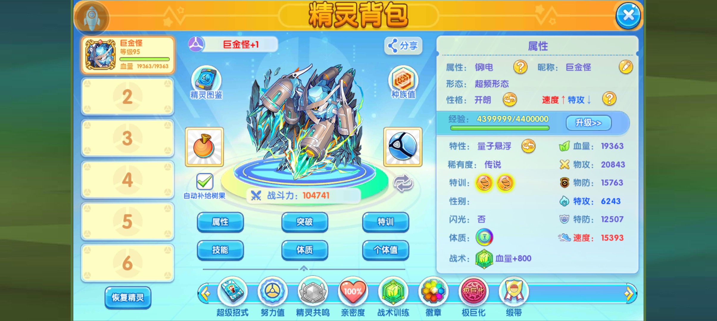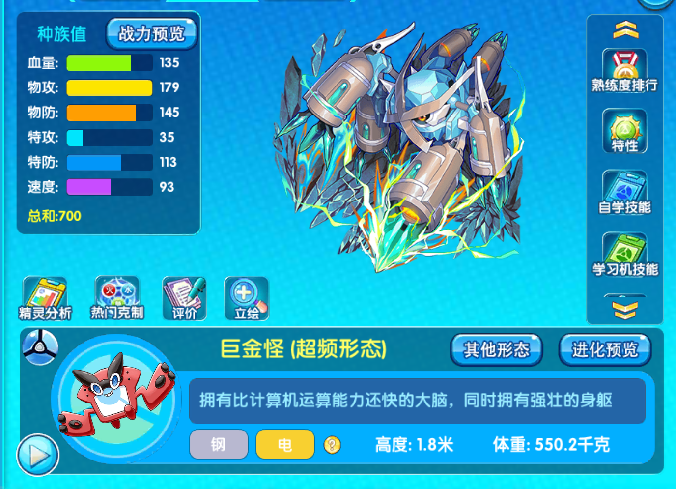 性格:开朗,努力值:速度物攻,道具:专属超导计算核心,特性:量子漂浮,极巨化
