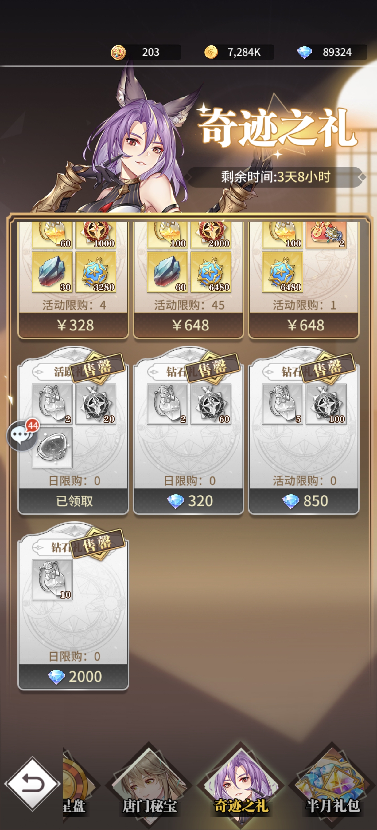 (一)对于零氪党:这次活动 45150钻石可以买到285抽 加上活动每日送的2次,也就是一周十四抽,理论上只有299抽,但是这活动还有个仙草大作战还有送的十抽,所以就是309抽,可以拿5个碎片,但是小编这里建议后面的9抽是多余的,可以少买点每日限购部分 最后一天320钻石买一次即可,剩下的不用买了。