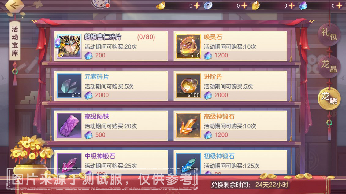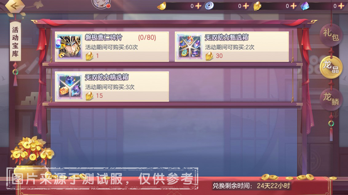 1、在【国之磐柱】活动中获得的稀有兑换代币「龙晶」,可在活动宝库中兑换「磐极曹仁碎片、无双助力甄选箱、无双助力精选箱」等稀有宝物;