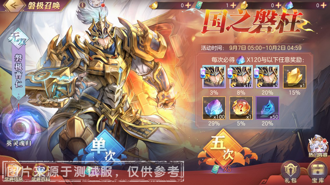 唤魂招募券:可在【磐极召唤】中招募「磐极曹仁」和「往期魂将」,单价500元宝,活动期间限购60次。