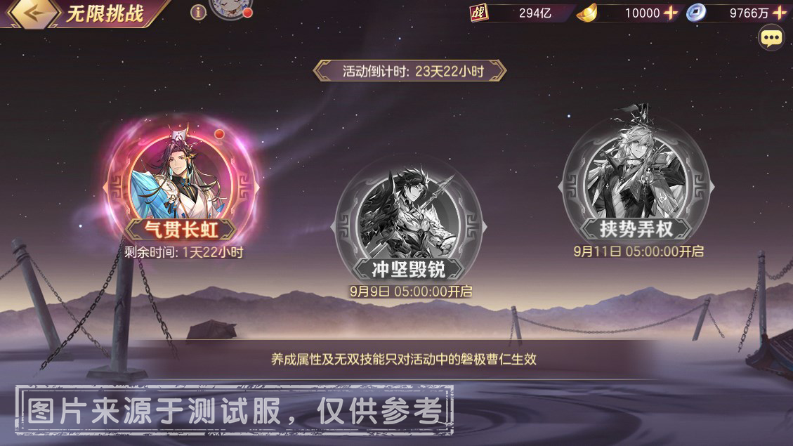 1、【国之磐柱】活动中的【养成】模块加成,仅对活动内(包含无限挑战与幻境试炼)的玩法有加成效果,对活动外模块无效果。该加成效果将在活动结束后重置。