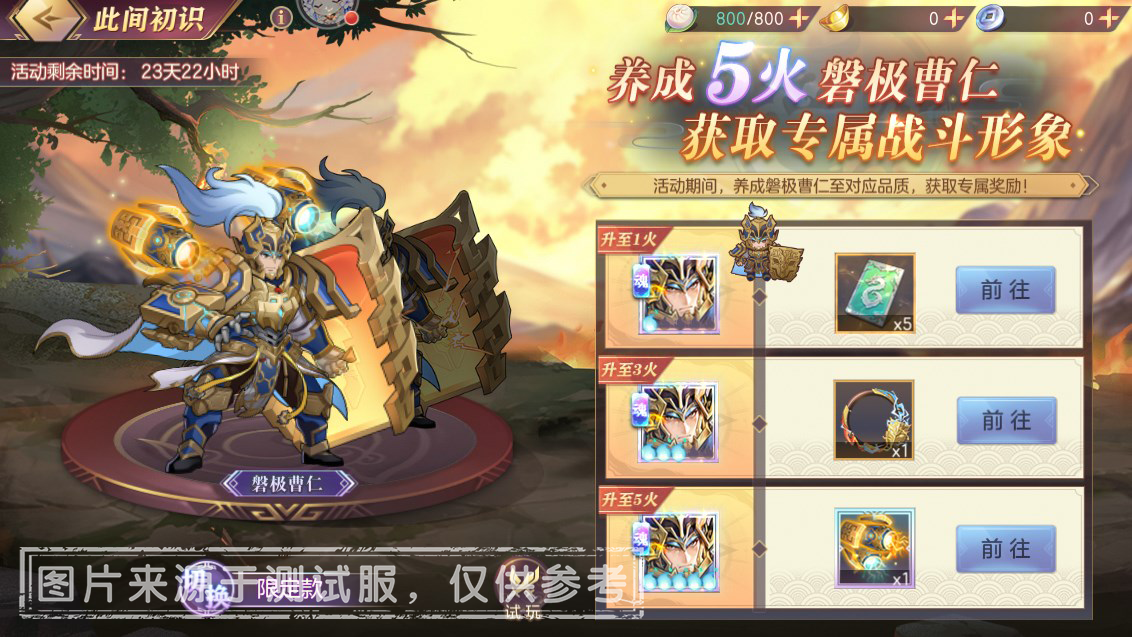 在【此间初识】模块中,本次活动将会开放「磐极曹仁-限定款战斗形象」,并可在该模块中进行试玩,该活动奖励可在「磐极曹仁」的觉醒等级培养至目标等级时获取!