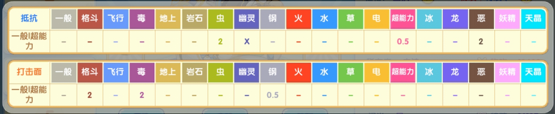 属性分析:弱点不多,虫和恶系。虫系还好,现在版本很少,恶系还是比较多的,队伍中可以配一些妖精和格斗系宝可梦来进行适当的联防。