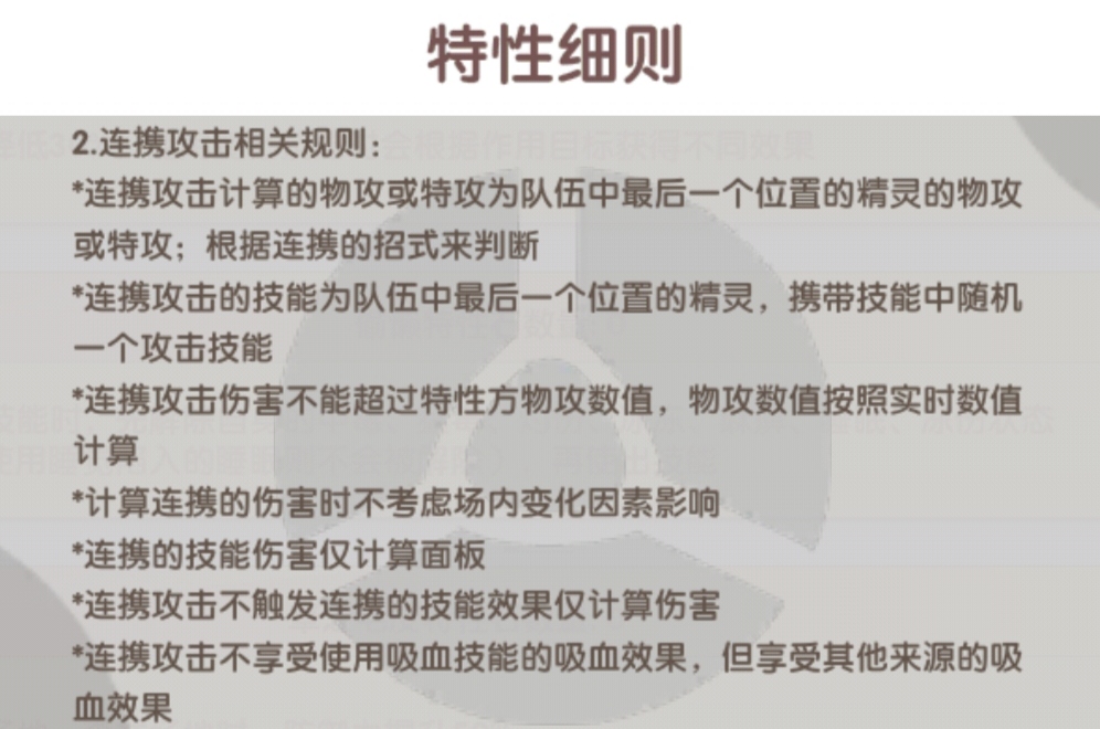 特性详析:连携攻击的话就是会按照队伍中最后一个位置的宝可梦的物攻或特攻进行计算,连携攻击的技能为队伍中最后一个位置的宝可梦所携带技能中随机一个攻击技能,因此队伍最后一个位置可以选择技能爆发高的宝可梦,同时连携攻击伤害不能超过智挥猩本身的物攻数值。