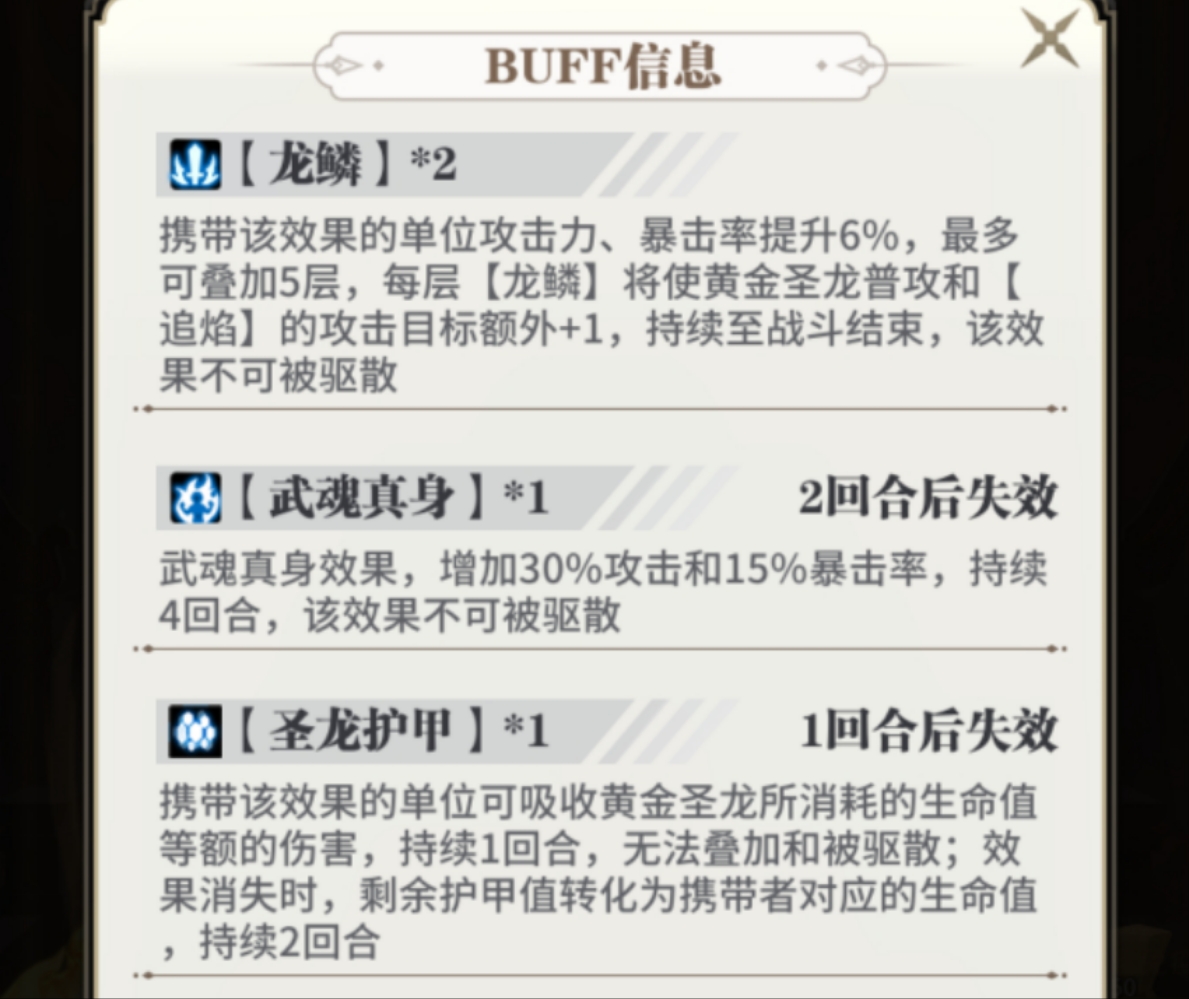 (由于黄金圣龙为群攻型输出,腐蚀及灼烧附加的概率较高,能有效的打出消耗和负面效果,可为队友提供负面效果层数叠加,打出更高的伤害)