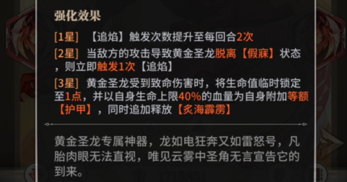 四、神器解析一星和二星分别提升追焰反击的次数,增加反击伤害,三星来到了史诗级质变,在受到致命伤害时进行锁血并反击一次大招,弥补了黄金圣龙生存能力偏差的缺点。