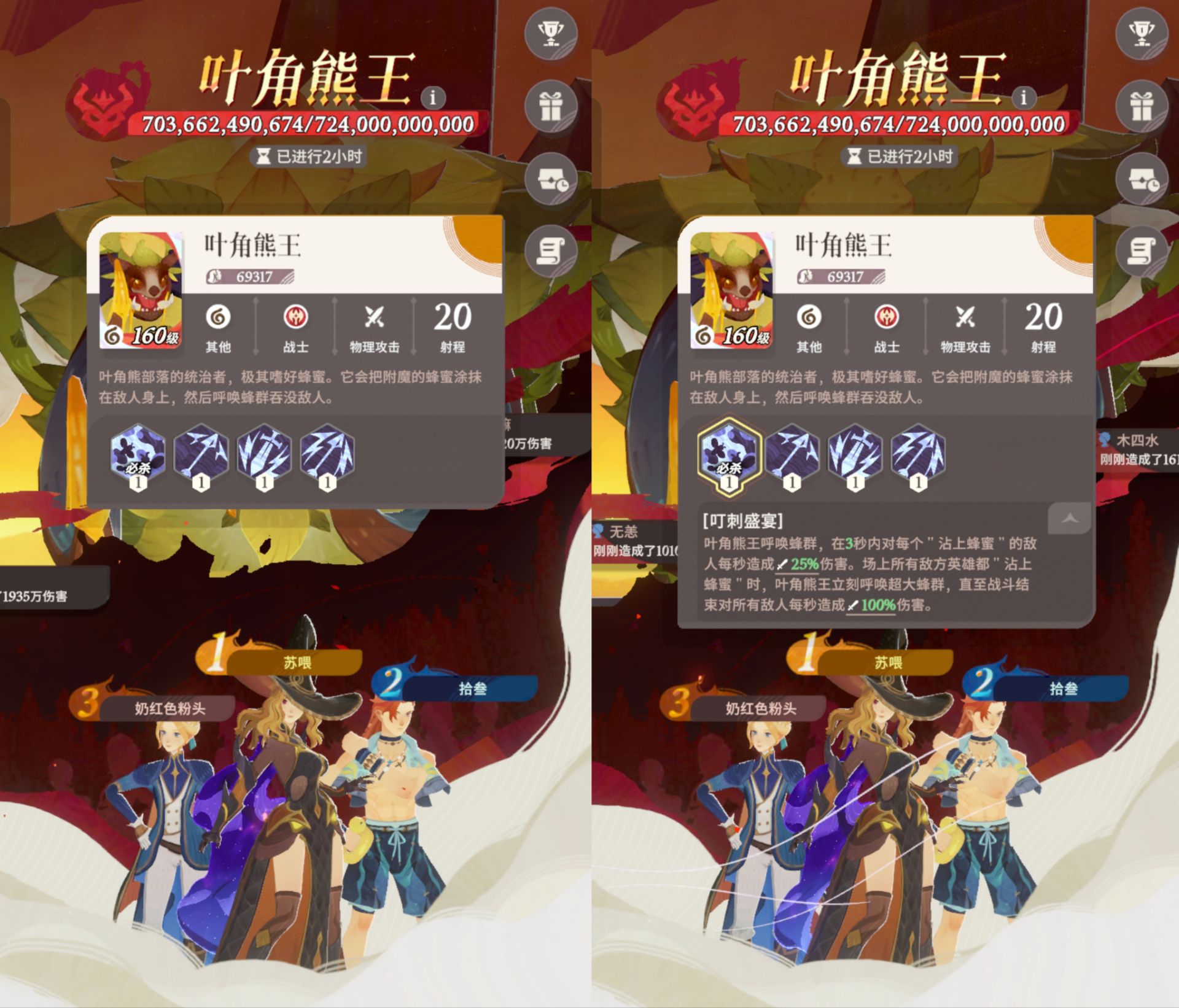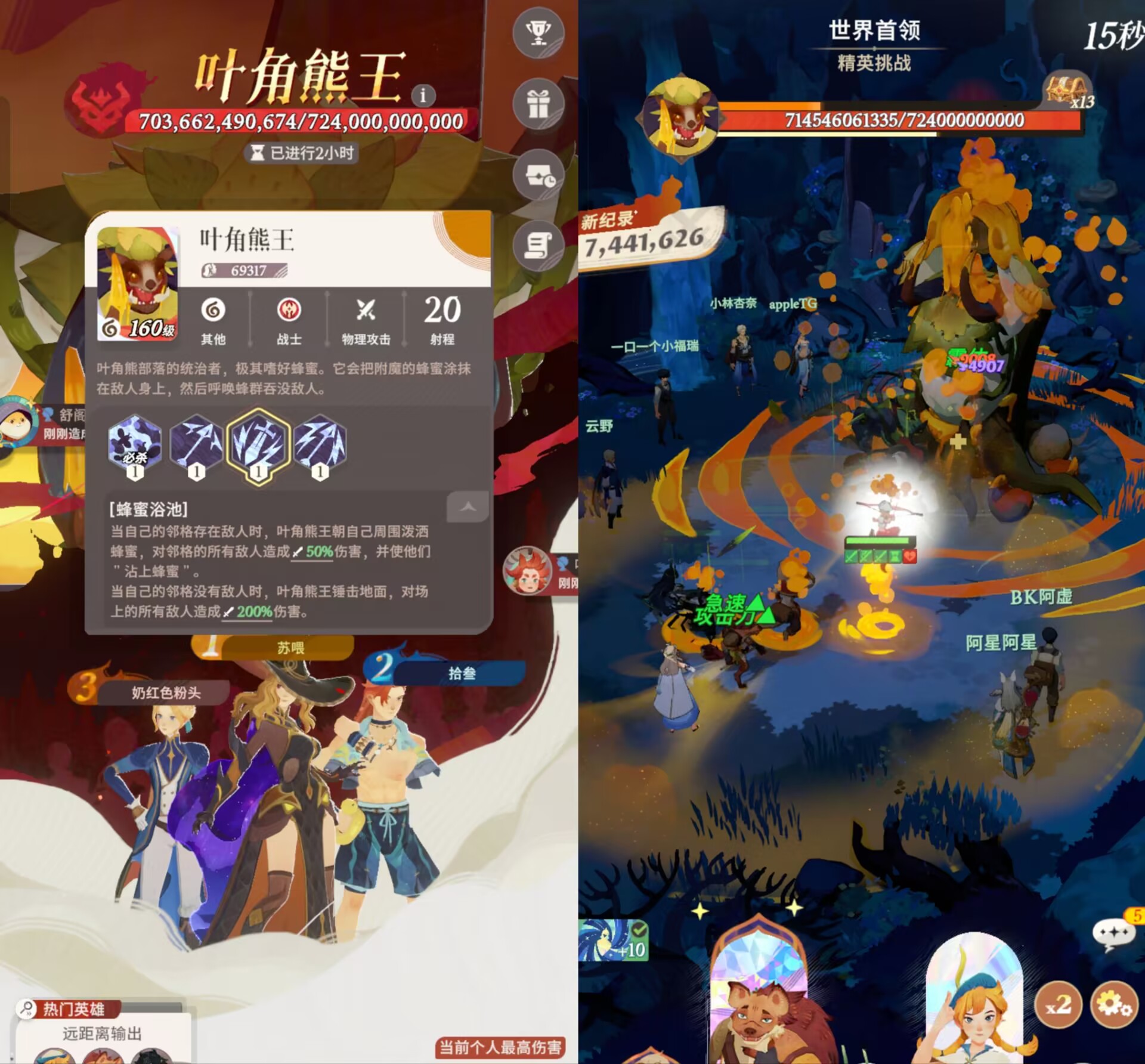 ①难点是:熊王非常肉,而且随着战斗属性会提升,后面又肉伤害又高,而且我方要是全体成员被沾上蜂蜜,配合熊王的攻击,容易被熊王秒杀。