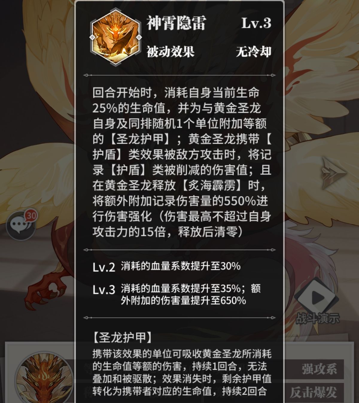 二、如何看待黄金圣龙的损血机制1、损血机制消耗自身35%的生命值,以此来增强自身的其他能力,看机制有点类似于现版本之子神劫唐昊的被动,但实际上并非如此,反倒成为他的鸡肋之处。
