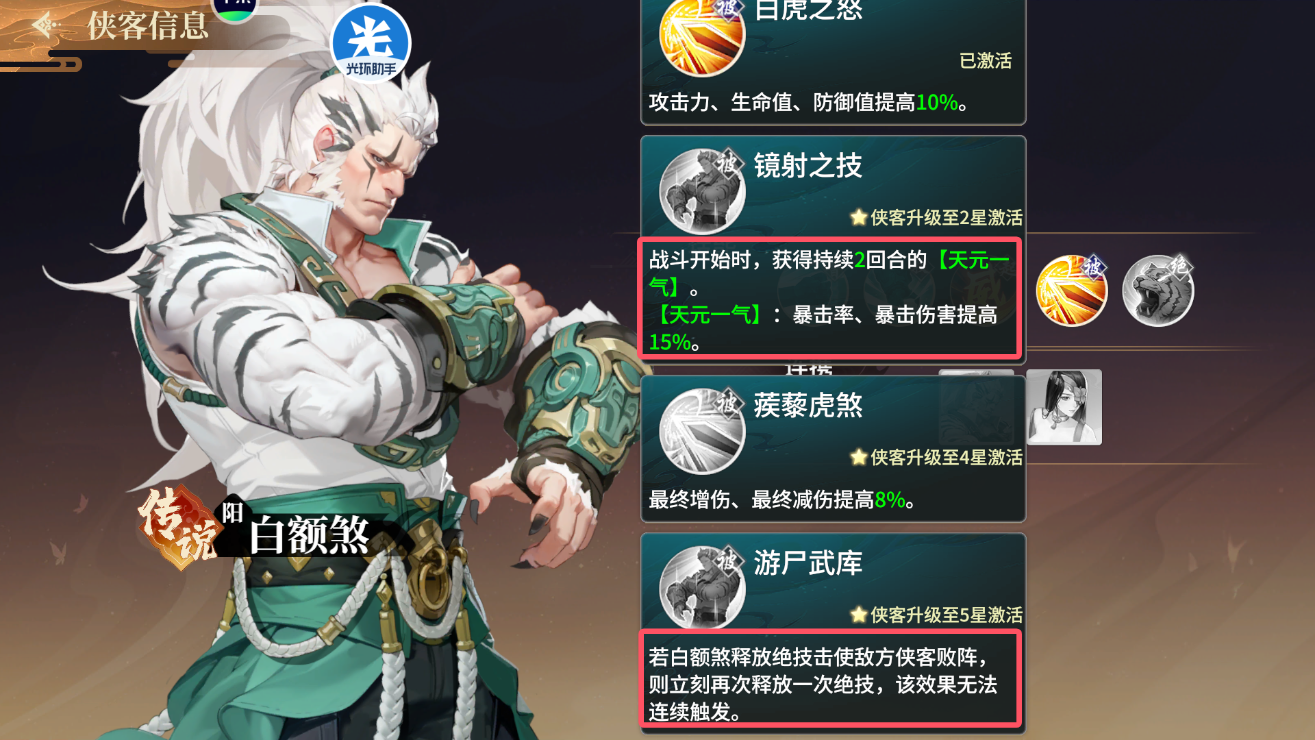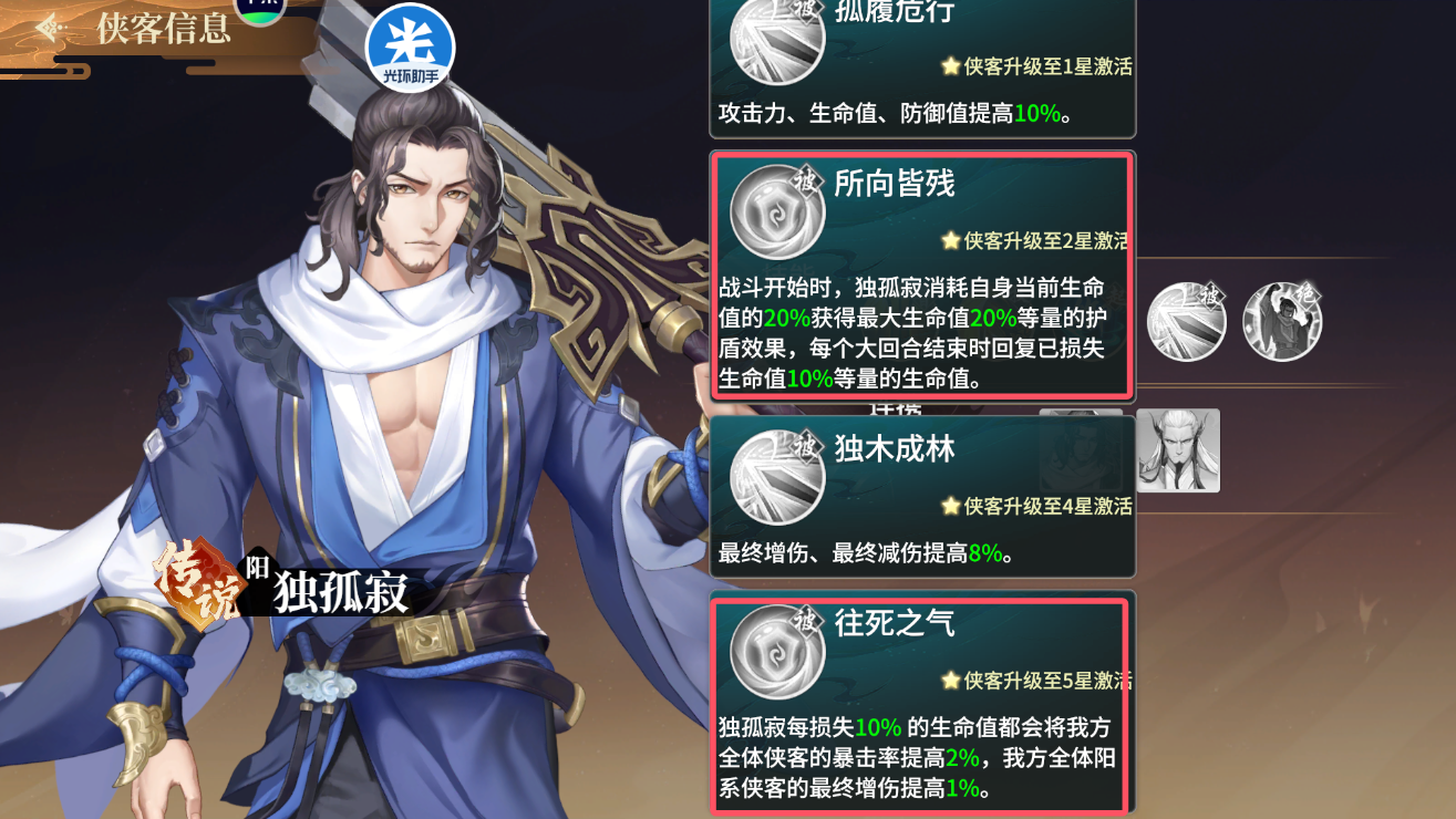 他的被动技能每当有敌方单位生命值首次低于60%时,他就能获得大量怒气。且击败一名侠客后,可立马释放绝技再次攻击,这个技能使得他在残局战斗中能够频繁释放绝技,保持持续的高输出。