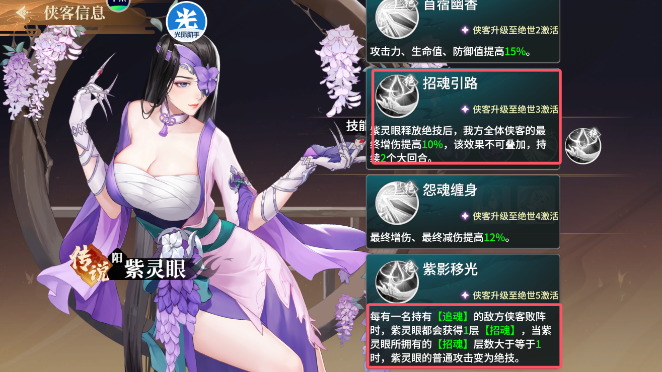 紫灵眼绝技释放,不仅给我方增伤,还给敌方生命最高侠客附加「追魂」,其他地方侠客受到伤害5%会附加给「追魂」侠客承担,且附带「追魂」的单位生命低于60%时,会降低敌方减伤。确保了敌方侠客快速融化的先决条件。