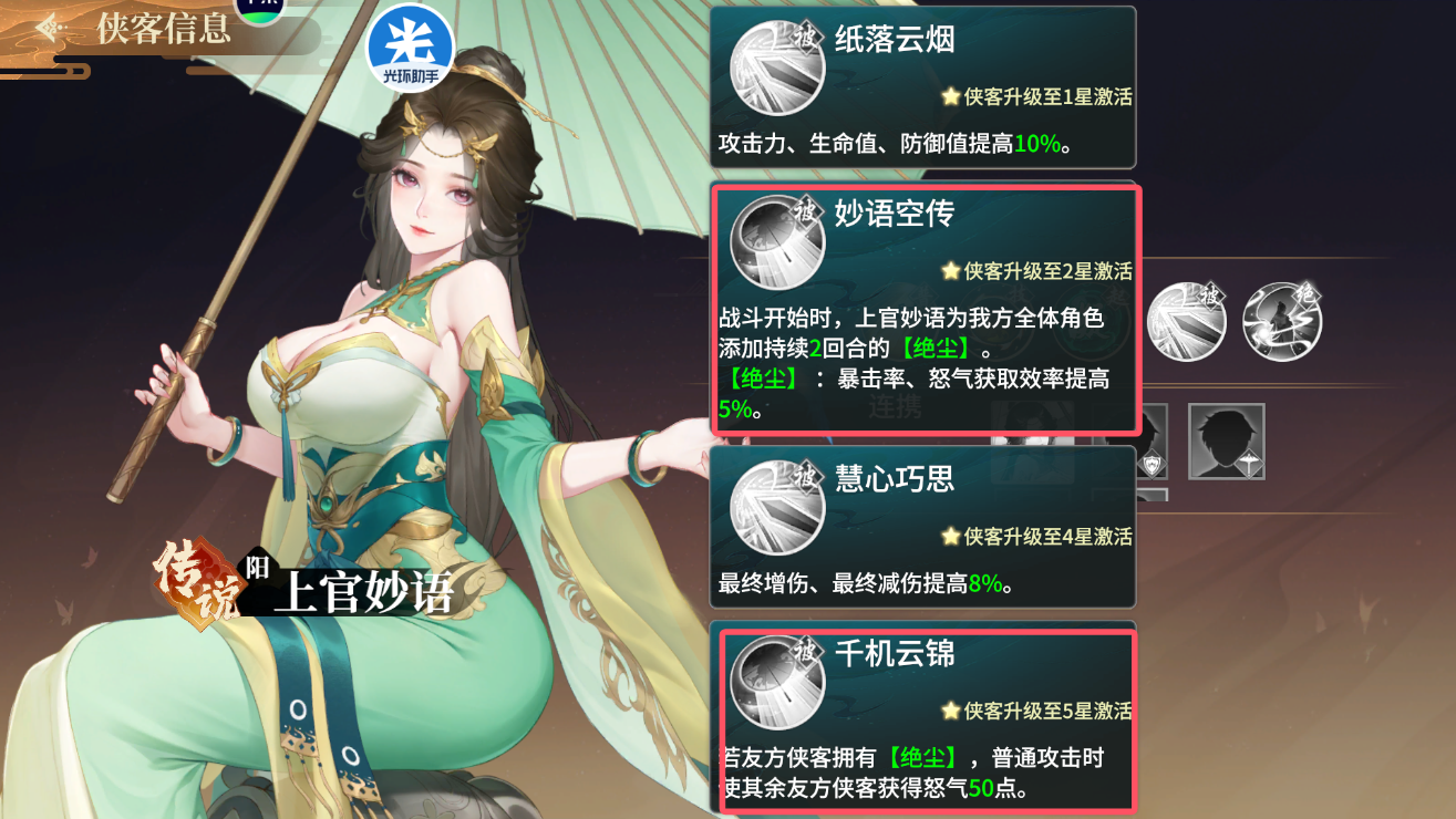 上官妙语的组合上阵效果也很实用。当上阵3名不同职业的侠客时,可以在战斗开始的前两个回合内抵抗控制效果,这可以有效地保护队伍免受敌方的早期控制。避免敌方高速控制先手,导致处于劣势。