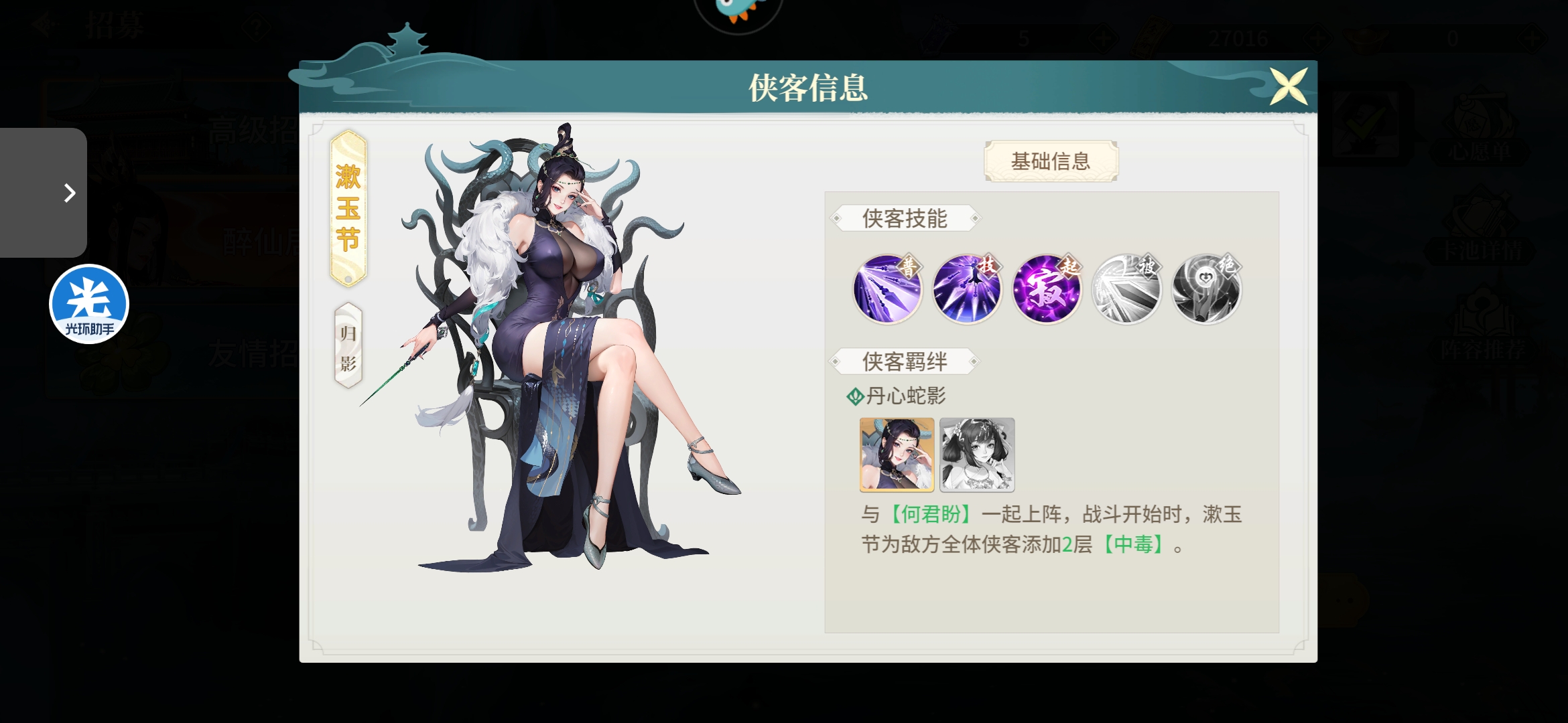 毒爆阵容核心,漱玉节主动伤害系数并不高,但自身多段输出可以快速叠加中毒状态,而自身绝技毒爆机制立刻结算一次中毒伤害可以提供阵容瞬时爆发能力,提高伤害阈值,升级为绝世品质后根据中毒层数额外回血回怒可以保证自身高频技能输出和续航能力